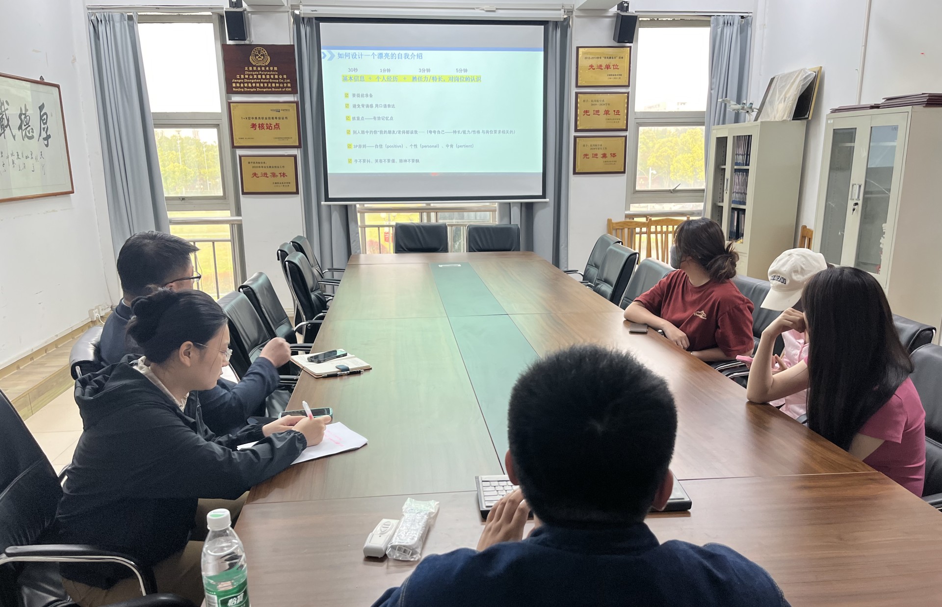 首先,顾轩宇老师结合当前大二学生即将开展顶岗实习,精心准备了“大学生就业指导 常见面试类型详细解读”为主题的公开月讲评试讲。他分别从课程导入、自我情况分析、面试准备、面试行为、模拟求职现场等环节进行宣讲。之后,查理及于文倩对顾老师试讲过程中的语言表达、肢体动作、课程进度、学生理解、接受程度等方面发表了建议。