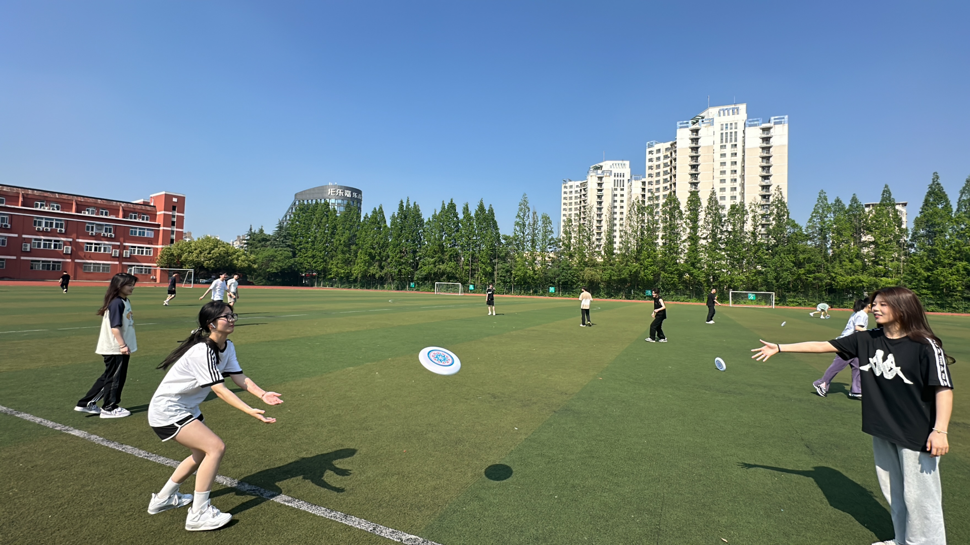 接着,系团总支体育部部长向同学们传授飞盘的基本技巧,详细讲解了握盘、发力、投掷等要领,并亲自示范了正确的动作。同学们按照社长的指导,分组进行练习,组内成员互相投掷飞盘,不断尝试和调整技巧。操场上飞盘翻飞,欢声笑语此起彼伏,拉近了同学们的距离。