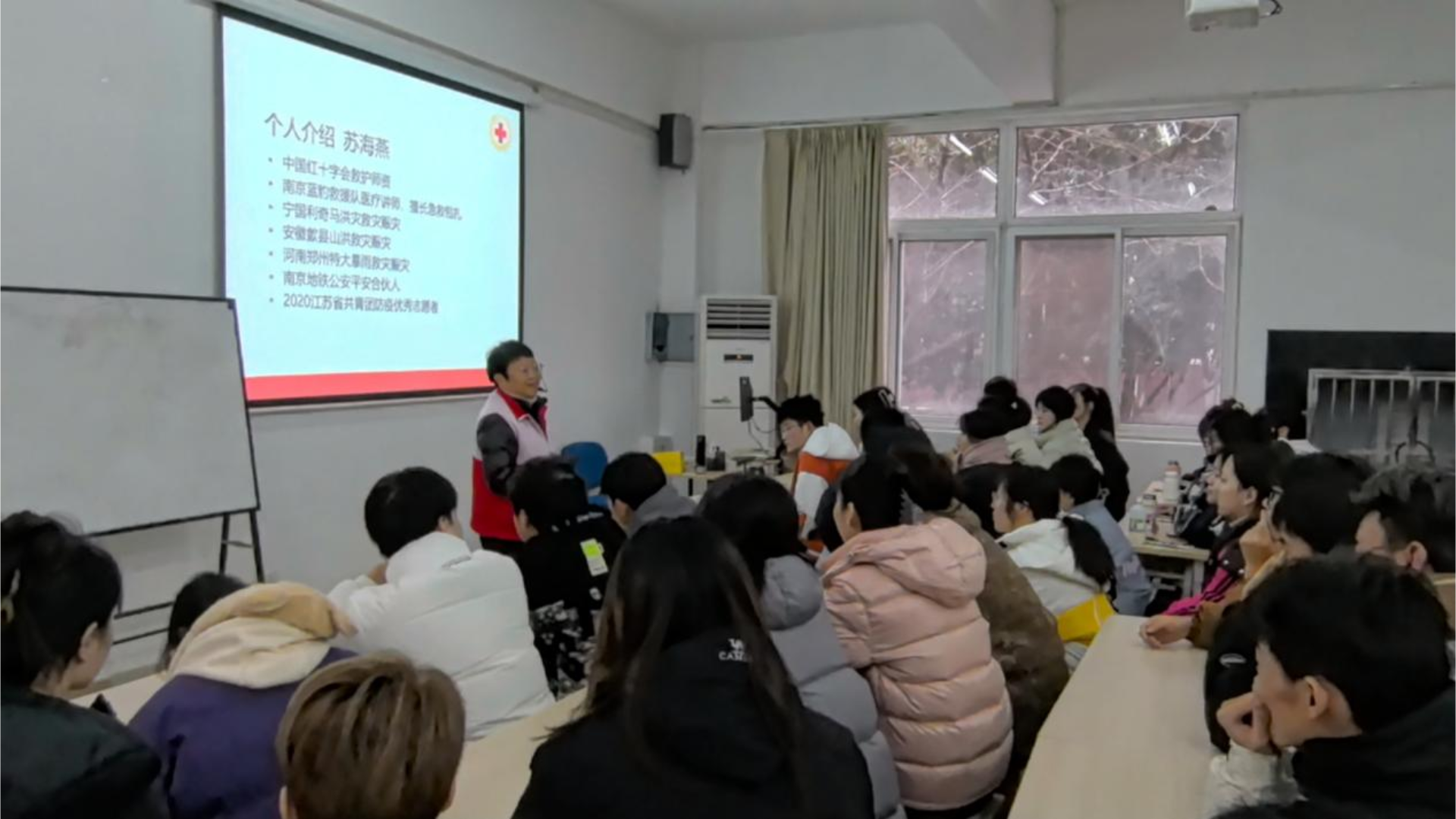 中国蓝豹(南京)救援队教官徐海、中国蓝豹(南京)救援队应急救护员苏海燕分别围绕心脏骤停现场心肺复苏术、自动体外除颤仪(AED)的使用、气道异物阻塞、伤口的包扎以及突发状况急救等内容进行了详细的讲解和现场演示,并指导学生运用CPR操作模拟假人、自动体外除颤仪(AED)、三角巾、绷带、敷料等包扎物品进行实操演练,以生动的语言,真实的案例为同学们上了一堂专业全面的急救课程。