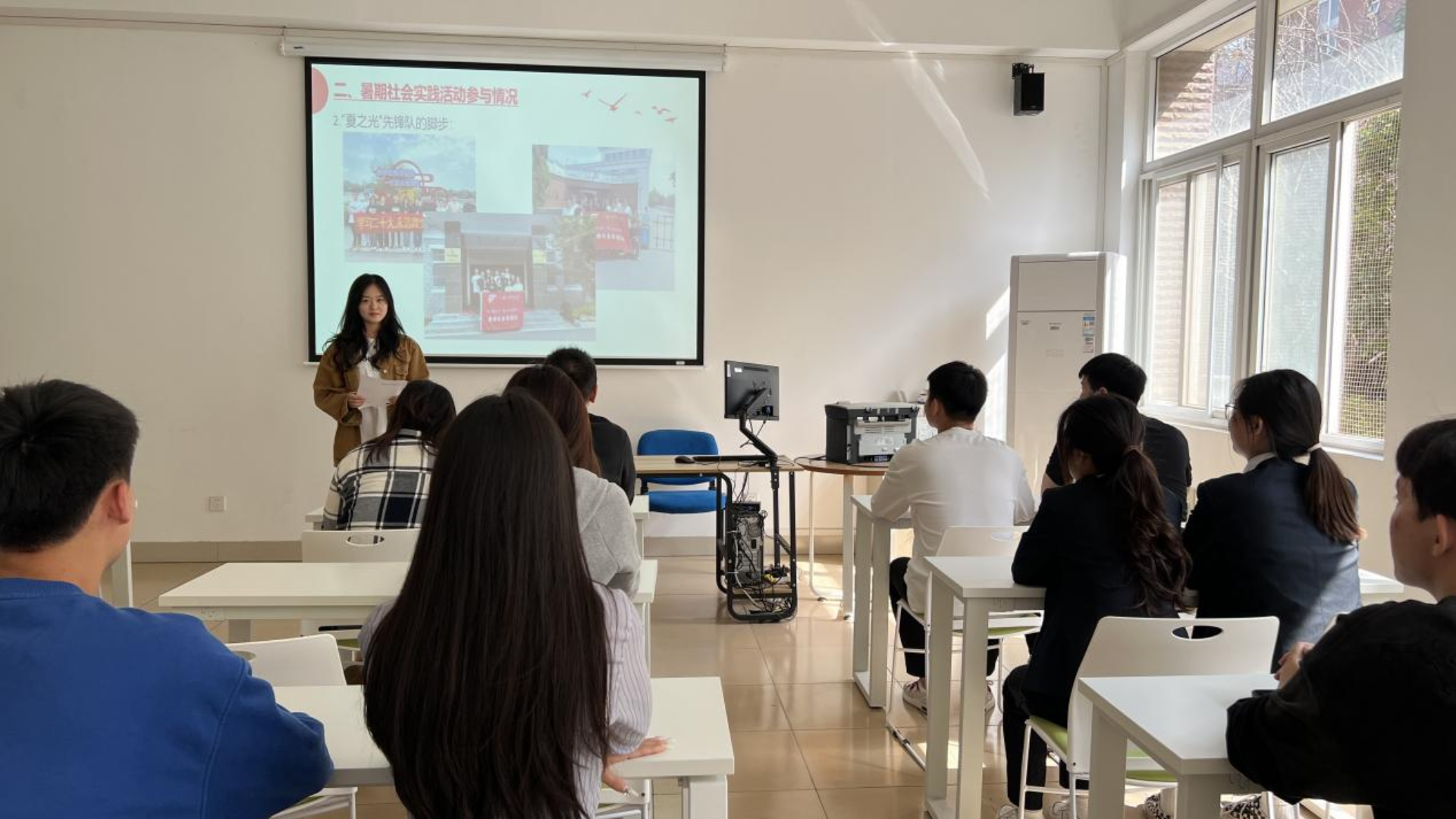几位学生入党积极分子从实践目的、调研实施、成果风采、典型做法等方面分享暑期社会实践的收获、展示实践成果、交流经验。他们通过讲述在江都水利枢纽、大运河博物馆实地学习考察调研的经历,引导同学们了解先辈光荣历史,带领他们学习感悟传承红色精神和工匠精神;讲述在东关街探访非遗项目传承人的故事,带领同学们感受中国传统文化的魅力。