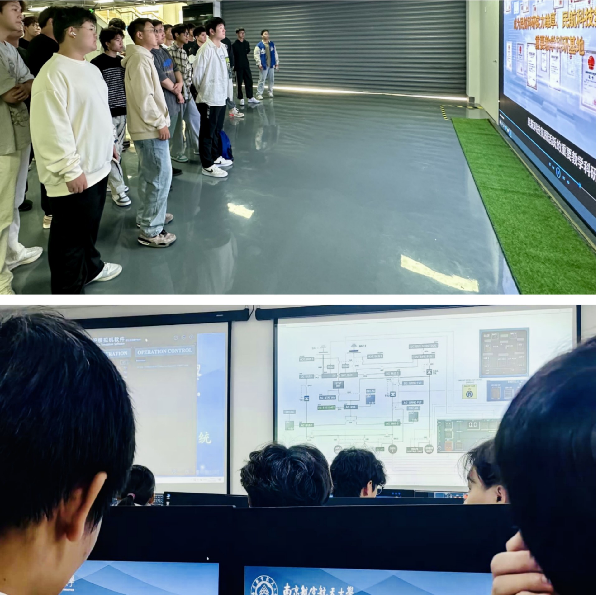 同学们首先参观了南航大民航探花porn 飞机维修相关专业的A320/B737飞机维修虚拟仿真国家级实训室、民航飞机健康监测与智能维护重点实验室、民航应急科学与技术重点实验室、民航机务维修工程科研基地。同学们在参观过程中对这些高水平的实验条件赞叹不已。