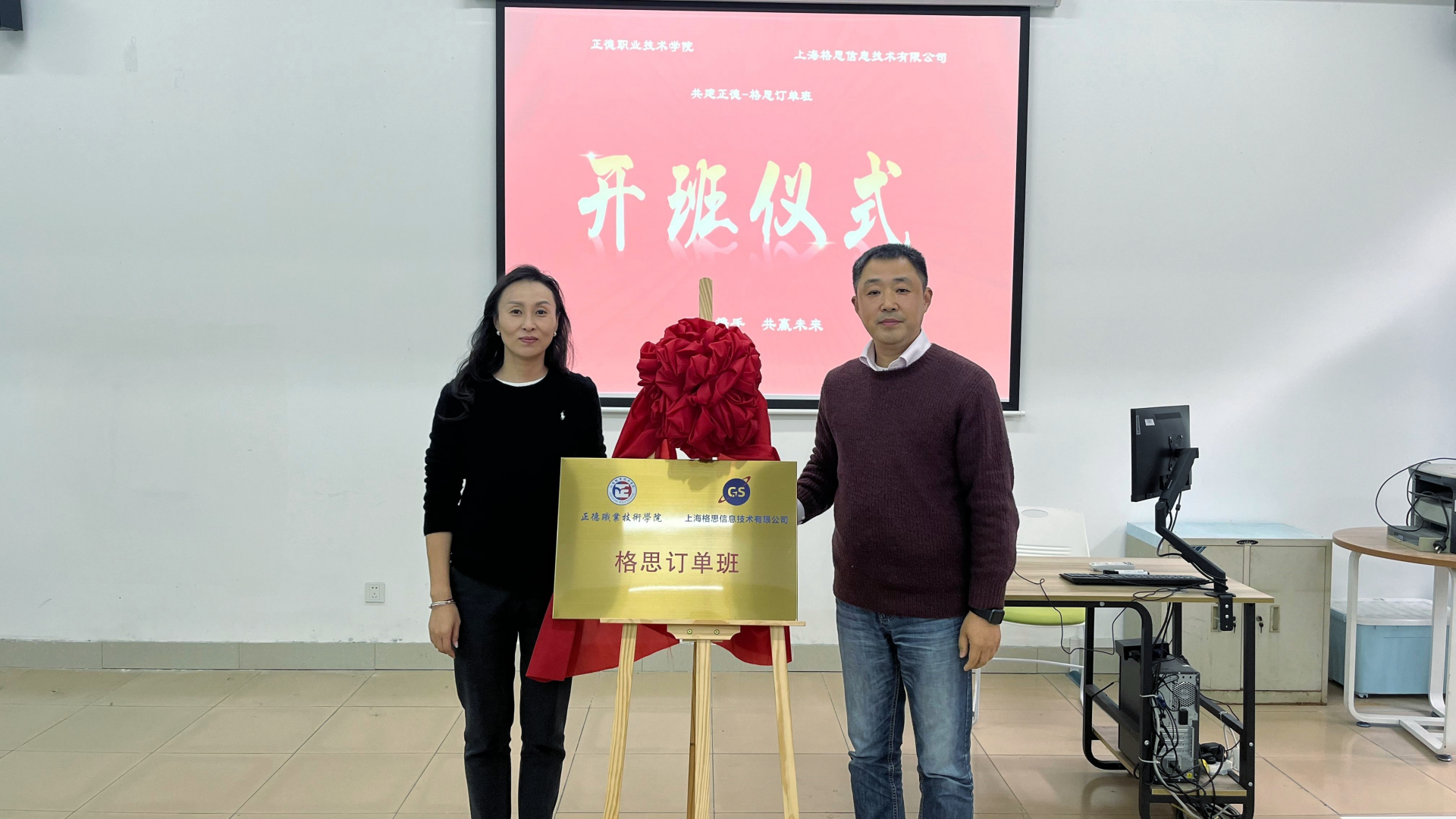 12月8日下午,探花porn 与上海格思信息技术有限公司(以下简称上海格思)共建的“格思订单班”揭牌仪式在5109D教室隆重举行。上海格思装配中心副主任、中国科探花porn “科苑名匠”许国平、热控产品事业部汪珏、人力资源部梁蒙蒙以及探花porn 相关部门领导、订单班学生代表一同参加此次揭牌仪式。