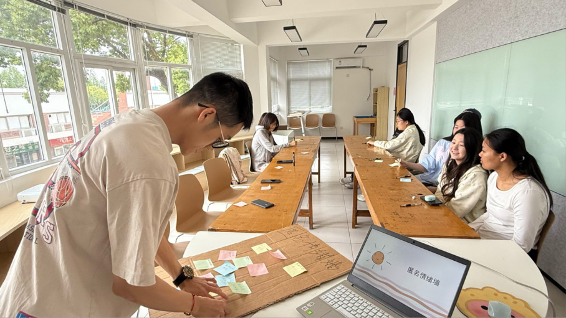此次活动以“树洞分享 + 互助共鸣”为核心,精心设置了多个特色环节。校园“匿名情绪墙”成为同学们倾诉的秘密天地,大家纷纷用便签写下学业压力、人际困惑等烦恼,或是暖心话语,自由取阅交换,形成独特的“情绪漂流”,在匿名分享中感受共鸣与慰藉。“情绪故事盲盒”线上接龙也开展得如火如荼,同学们通过文字、手绘表情包传递着彼此的共情,打破隔阂,在交流中获得理解与支持。此外,活动现场还打造了5分钟“情绪充电站”,通过播放轻缓白噪音或励志短视频,为同学们提供了快速舒缓情绪、补充能量的空间。