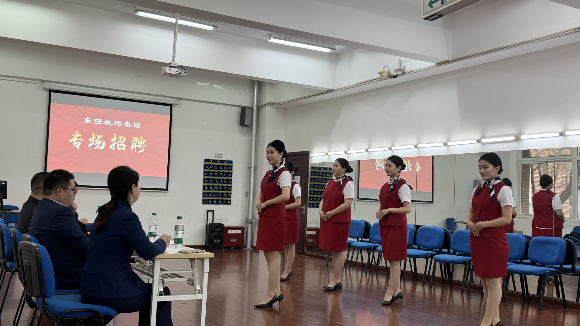 3月27日上午,东部机场集团在民用航空系5109民航实训中心举行了地面服务岗位专场招聘会,为空中乘务专业提供了优质的实习就业机会。