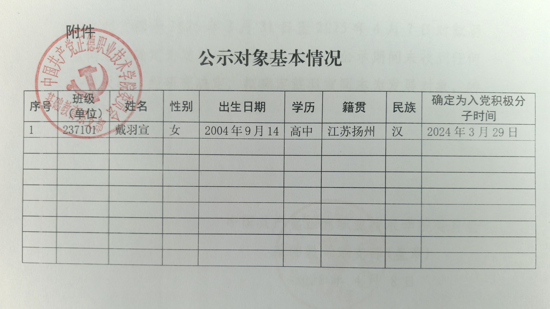 经党支部培养教育和考察,在听取党小组、培养联系人、党员和群众意见的基础上,经支委会2025年3月31日讨论,拟确定戴羽宣同志为发展对象。根据发展党员工作有关要求,现将其有关情况予以公示(见附件)。