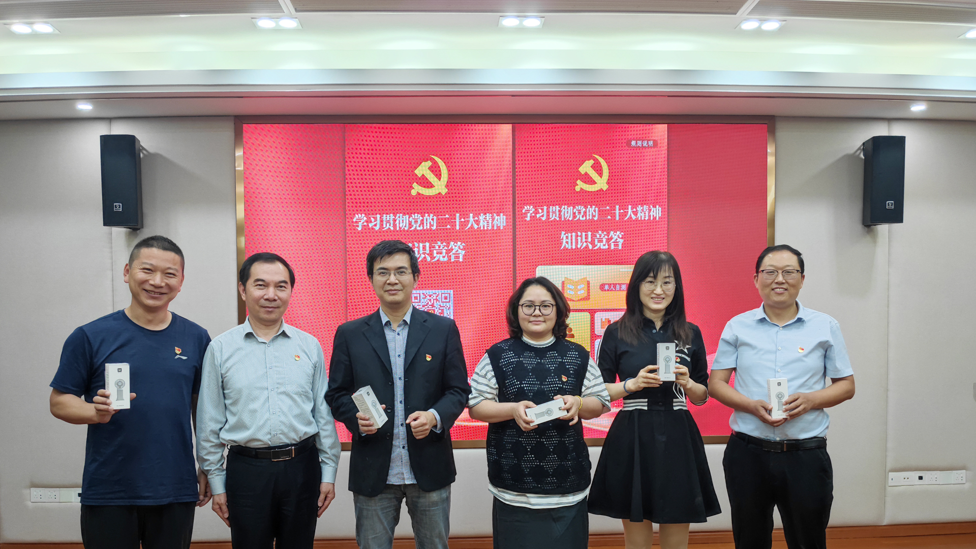 在二十大知识竞答环节,两个支部的党员运用共产党员网二十大精神知识竞答模块开展了学习大比拼,在规定的时间内完成答题,根据支部内部竞答成绩各自选出前5名,再进行支部之间的比拼,最终5名同志获得优胜奖。人事处处长刘玉宝为获奖同志颁发了奖品。