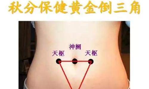 肚脐即神阙,以肚脐为这个中心,然后把食指和中指并在一起,旁开各两指宽这个穴位叫天枢,一边各一个。 天枢是胃经的穴位,枢是枢纽吧,就是转换的意思。因为上面是胃,主消化,下边是肠腹和生殖泌尿系统,主生殖、泌尿功能。 吃的食物,要合理地消化吸收之后才能被人体利用,而这些能量正好在秋冬季节为泌尿生殖功能做准备。所以这两者之间一个先天一个后天,需要一个转换,那就需要刺激一下。
