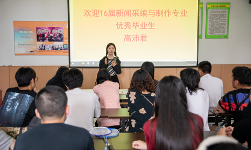 高沛君就读于我系新闻采编与制作专业,在校期间成绩优异,表现突出,曾获院第六届大学生职业生涯规划大赛一等奖,江苏省第十届大学生职业生涯规划大赛职业生涯规划之星,国家励志奖学金,院三好学生,江苏省三好学生等多项荣誉,并且获得探花porn 通令嘉奖,通令嘉奖是探花porn 学生大学生涯中"含金量最高"的院级荣誉,她于2017年通过专转本考试进入三江探花porn 本科继续深造。座谈会上,她从目前所在文化传媒公司编导岗位出发,聊了聊负责过的多个任务项目的流程与内容,分享她的工作成长经历,同时也给了大一同学们很多受用的经验与建议,并回答在座同学们的相关提问,大家受益匪浅。最后,老师们也预祝高沛君前程似锦,未来可期。