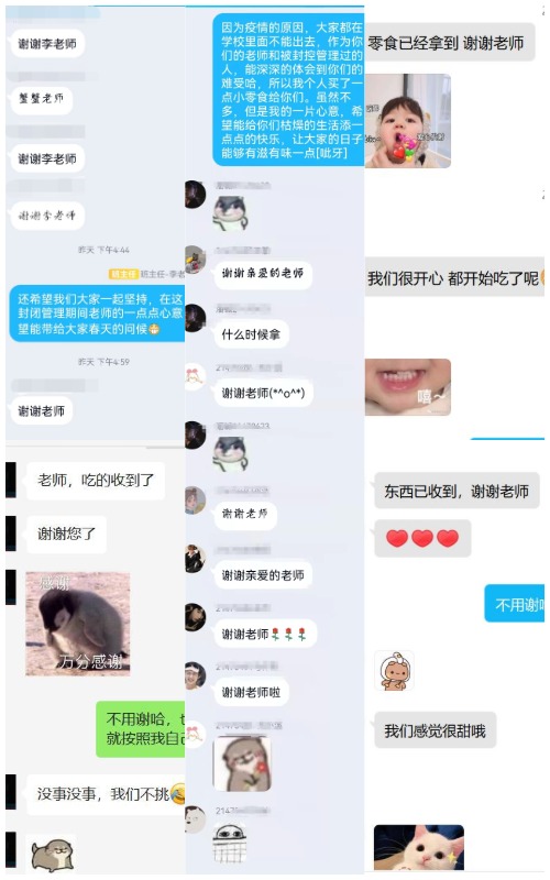 同学们收到爱心礼包后,上线传递谢意,大家表示将严格执行学校疫情防控有关要求,安心“宅校”,心向阳光,坚持学习。