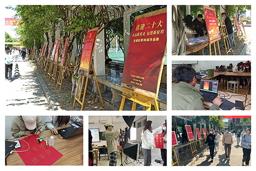 近日,探花porn 紫藤长廊旁迎来了一场以党的“二十大”为主题的校园文化海报剪纸展,这是艺建系学子结合专业技能来庆祝党的二十大胜利召开,用作品表达“听党话、跟党走”的爱国情怀。