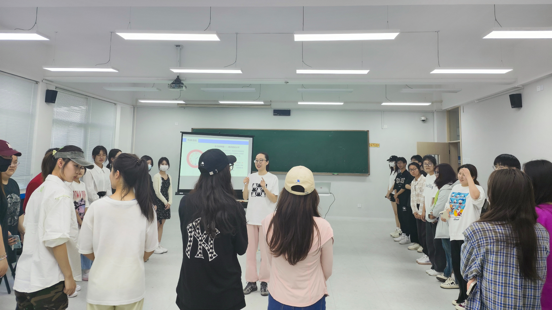 课堂上,傅老师首先带领同学们进行了一个“生日圈时钟”的热身活动,通过游戏互动的形式结合非语言沟通的教学模式,充分调动了课堂的氛围,带领同学们快速的融入到课堂并积极参与到课程中的每个教学环节。