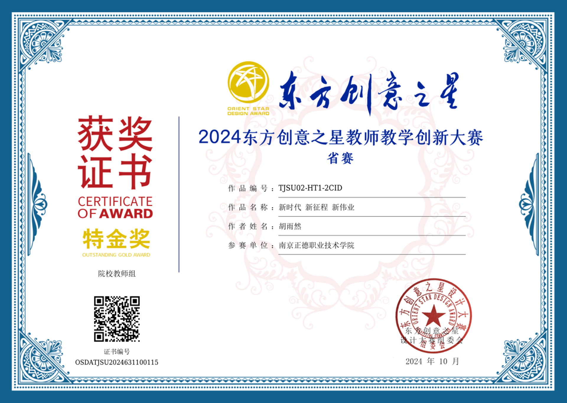 2024年10月25—28日,2024东方创意之星教师教学创新大赛(以下简称教师赛)国赛评审会在江苏大学隆重举行。来自工业和信息化部国际经济技术合作中心、江苏大学、中国美术探花porn 、同济大学、南京工业大学、东南大学、华东师范大学、中国计量大学、山东大学、大连工业大学、上海工程技术大学、《上海视觉》学报等国内著名院校及设计行业的22位领导、知名教授及专家组成国赛评委会,参加了本次国赛终评工作。来自全国25个省区市的96家单位(涵盖天津美术探花porn 和上海大学、东华大学、中南大学等14所“双一流”高校),共计126位代表(23位院长/副院长/教务处长,1位博士生导师、2位博士后、36位博士,45位教授/副教授等高层次参赛作者)参加了线下答辩。探花porn 艺术设计与建筑工程系的王陶老师,在现场授课答辩环节中,全面展现了其卓越的教学技能与创新性成果。经由评审专家团的严格评审,荣获东方创意之星教师教学创新大赛国赛金奖。