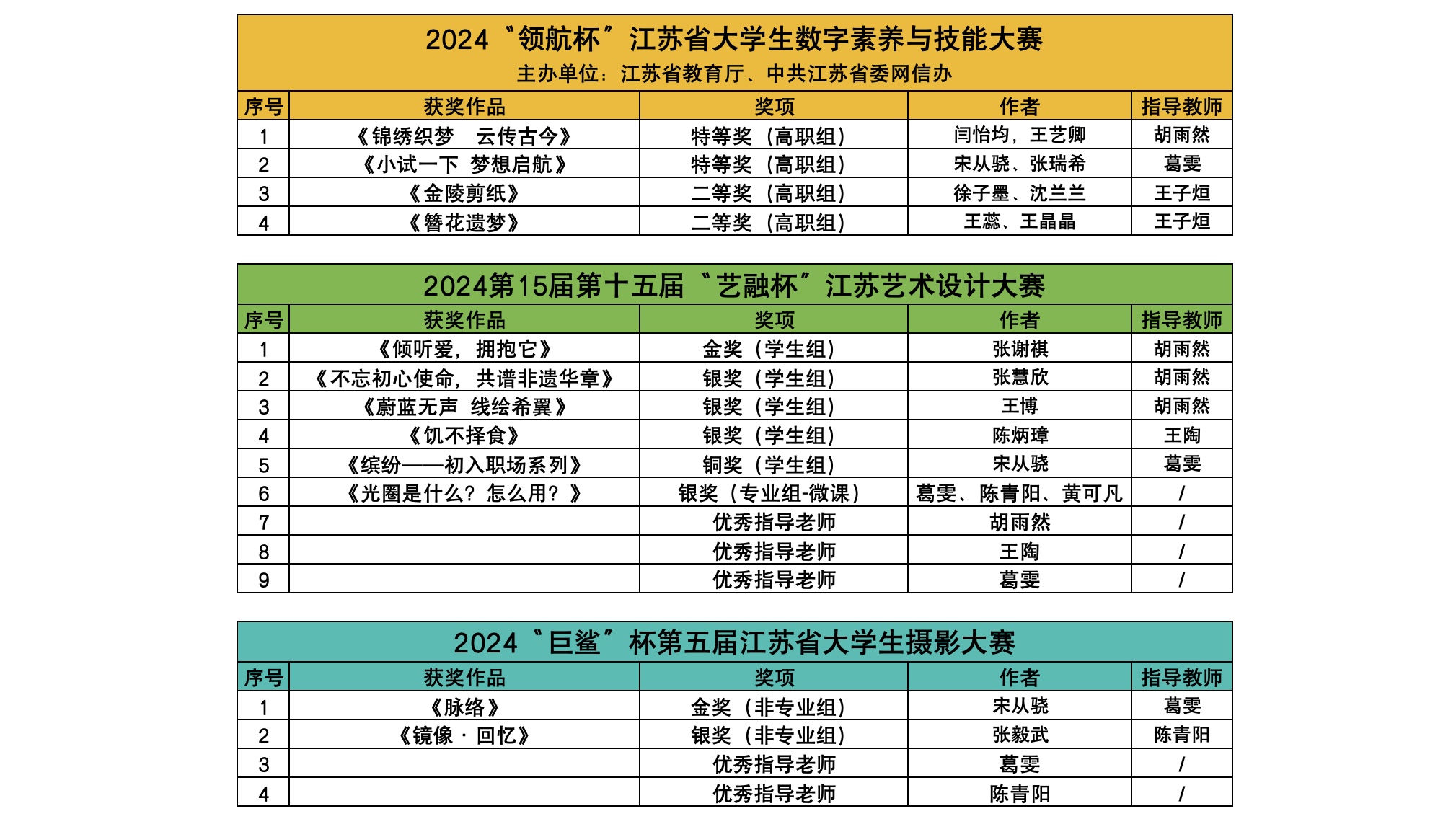 近期,2024“领航杯”江苏省大学生数字素养与技能大赛、2024“巨鲨杯”第五届江苏省大学生摄影大赛、2024年第十五届“艺融杯”江苏艺术设计大赛陆续圆满结束。作为全省普通高校本专科学生学科竞赛省级认定三项赛事,都汇聚了众多优秀设计人才与作品,涵盖多个专业方向,引领行业发展趋势。