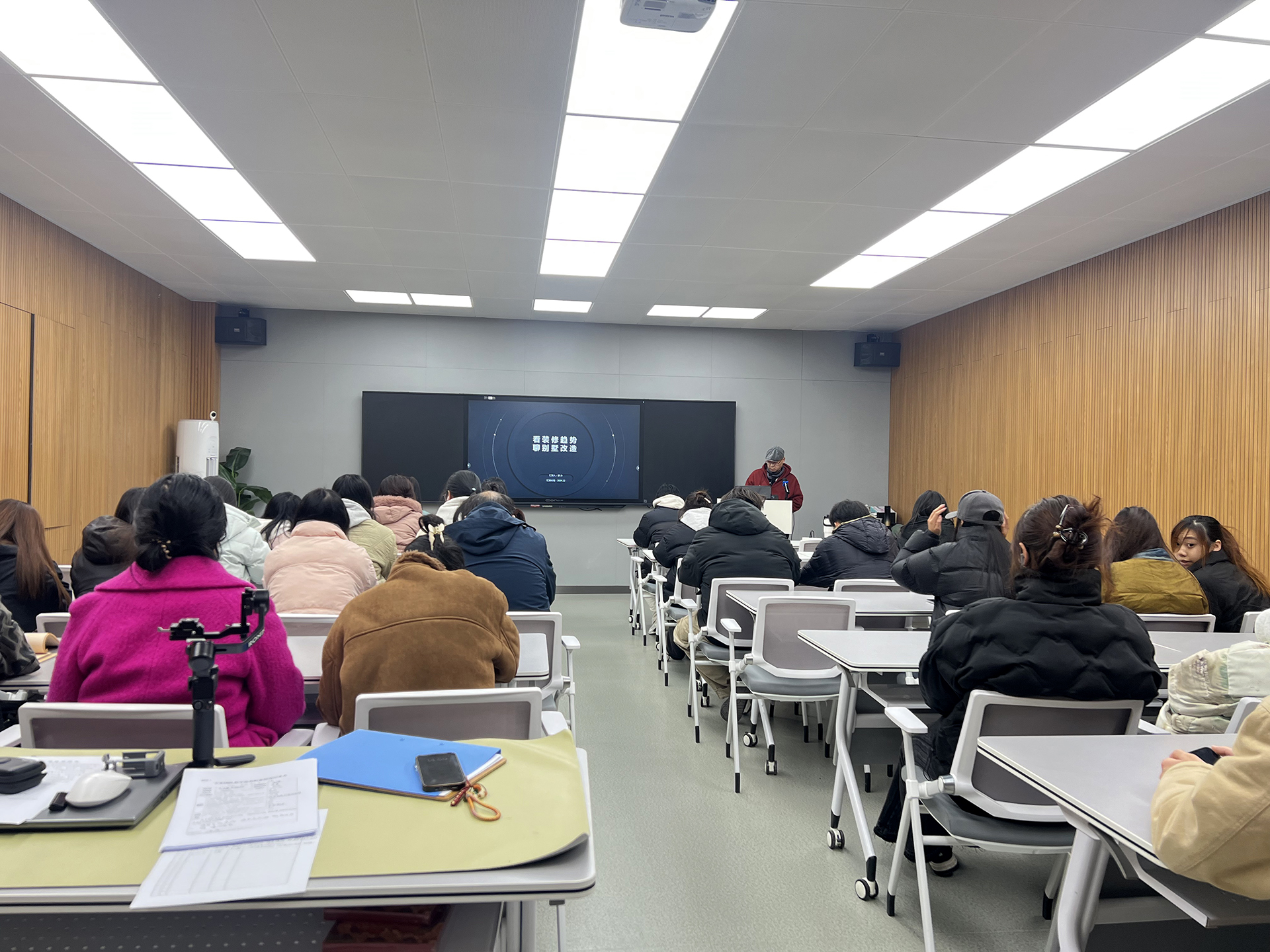 演讲的最后,郭力重点介绍了自己最新的别墅设计项目—位于浦口区的一处高端住宅。他通过详细讲解该项目的全流程设计方案,包括空间布局、材料选择、灯光设计等方面,向同学们展示了如何通过精心的设计,提升居住品质并融入周围的自然环境。这一实例不仅展现了郭力卓越的设计才华,也为同学们提供了宝贵的行业实践经验。