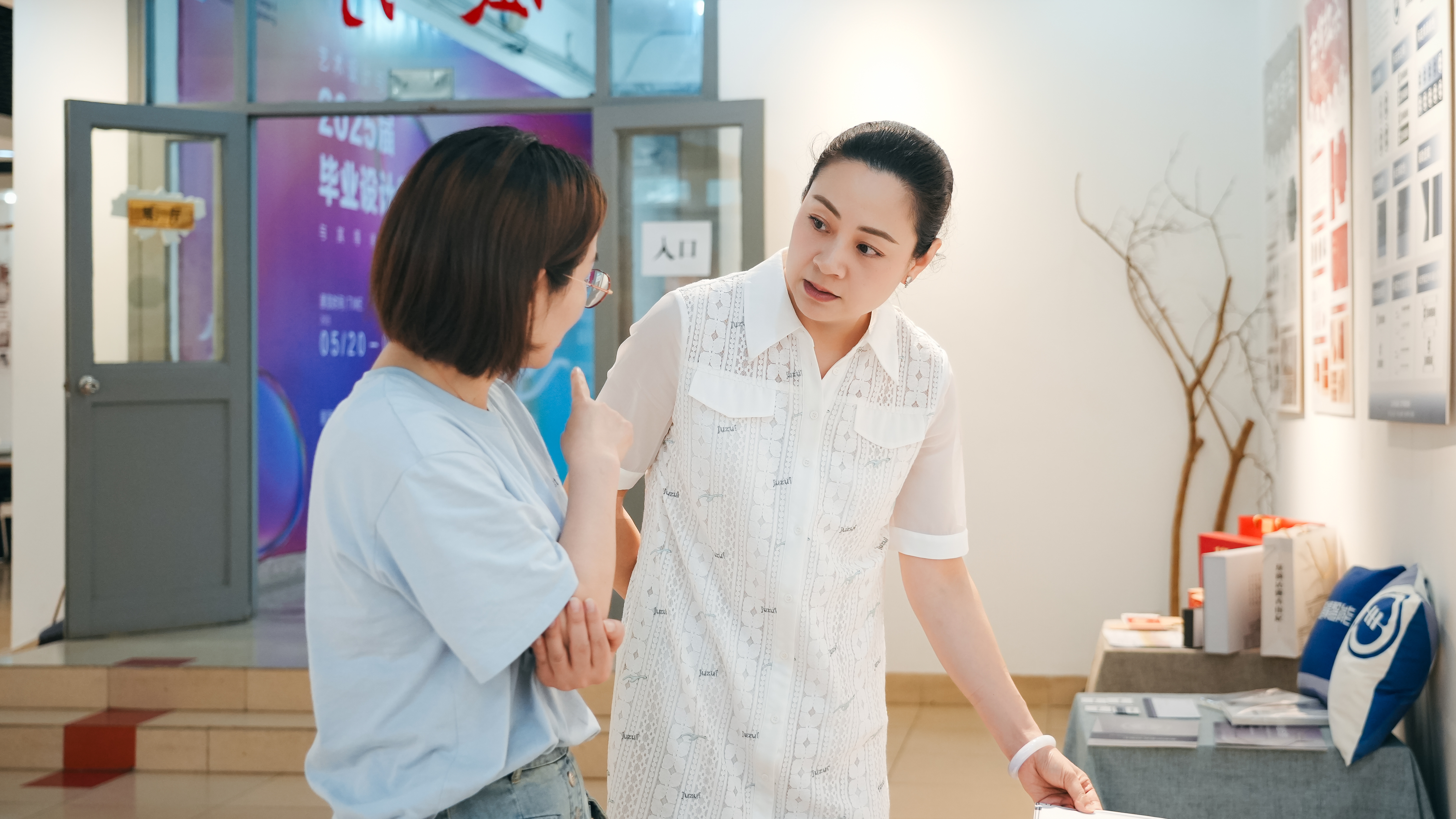 参观过程中,孙雷详细询问作品构思过程与技术应用,对艺建系紧扣社会需求、服务民生的设计实践给予高度评价。他强调,艺建系应进一步深化校企合作,探索“产教融合”新模式,为社会培养兼具专业能力与职业素养的高素质设计人才,并寄语毕业生“以创新为帆,以实践为桨,在职业道路上绽放光彩”。梁薇则肯定了学生的创新思维与实践成果,指出展览为校园文化注入了鲜活的艺术活力,期待未来涌现更多具有社会影响力的设计作品。