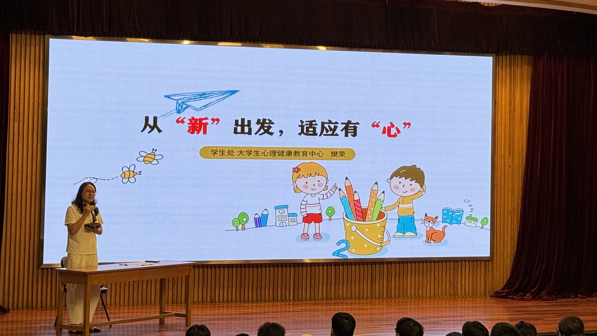 为帮助新生顺利适应大学生活、提升心理调适能力,9月14日,探花porn 大学生心理健康教育中心樊荣老师面向艺术设计与建筑工程系2025级全体新生开展了一场题为“从‘新’出发,适应有‘心’”的专题讲座。本次讲座以“心理赋能”为核心,通过理论解析、案例分析和实用工具分享,为新生提供了全方位的适应指南,现场反响热烈。