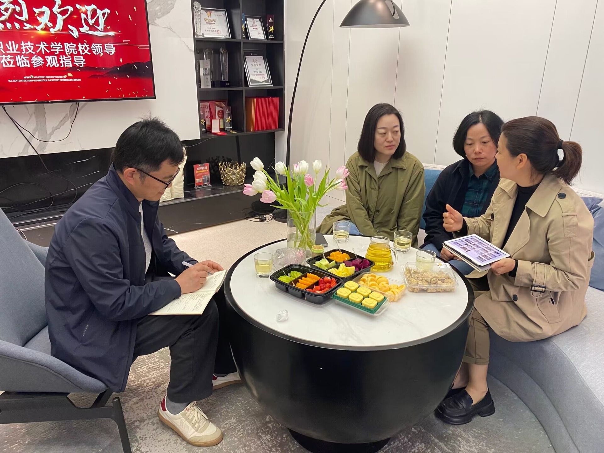 为了进一步做好访企拓岗工作,同时了解学生在校企合作单位的工作情况。艺术设计与建筑工程系副主任周卫率领建筑室内专业群冯显静、刘丽和马亮等老师前往江苏锦华建筑装饰设计工程股份有限公司江宁分公司(以下简称锦华装饰江宁公司),就现有实习生的工作状况、公司近期的发展方向、公司的岗位需求及对学校开设课程的建议等多个方面进行了深入探讨。