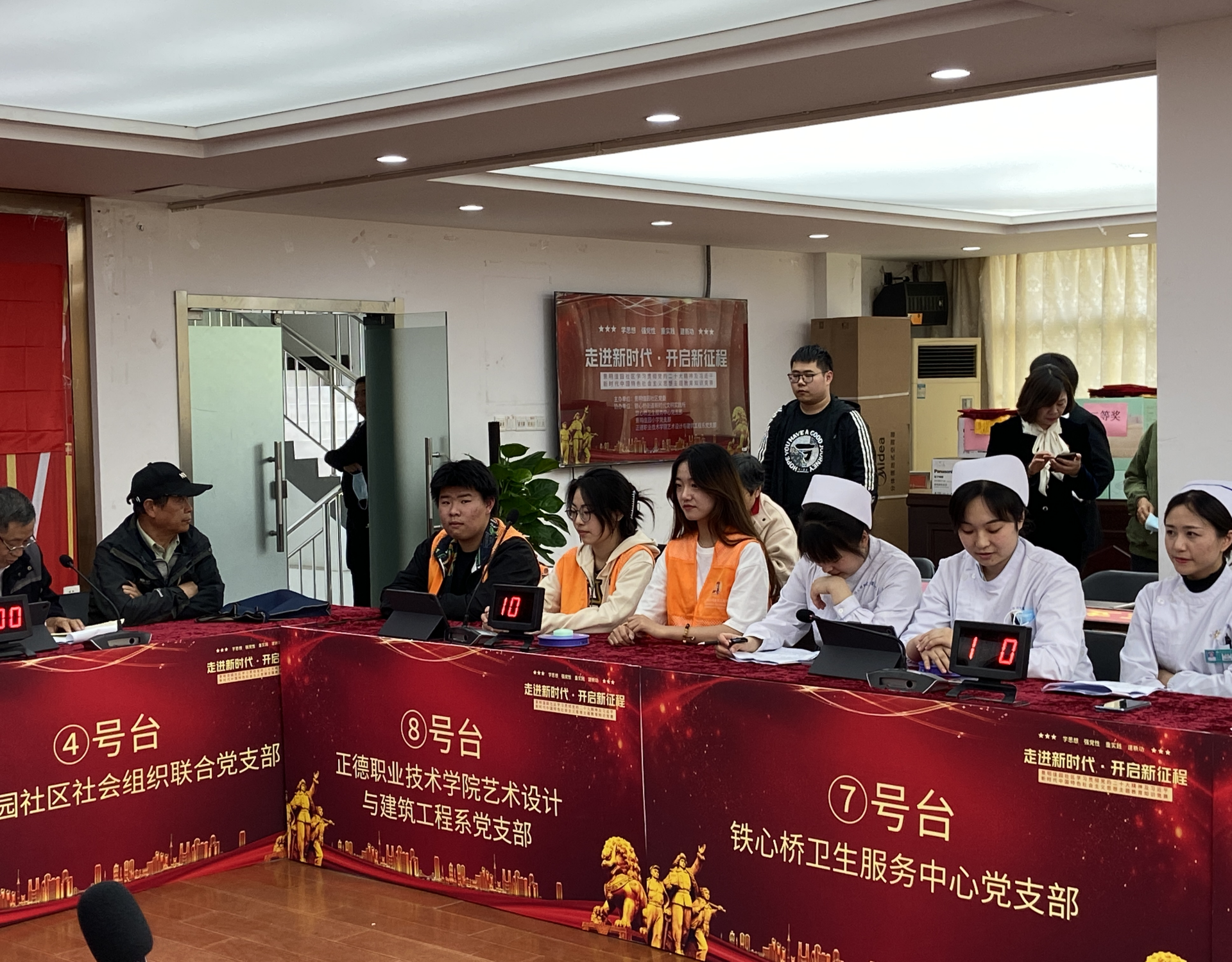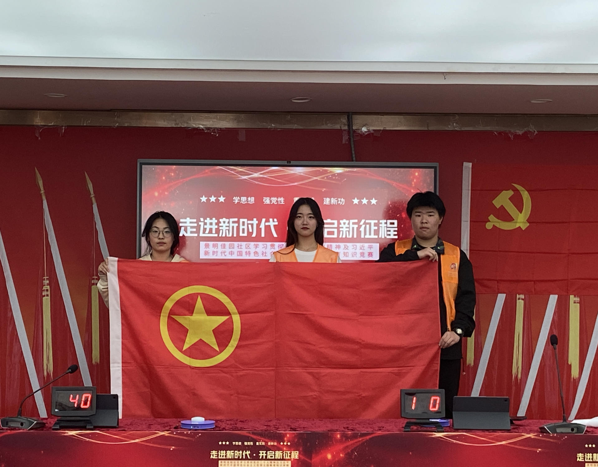 为深入学习贯彻党的二十大精神,引导支部成员和入党积极分子自觉以习近平新时代中国特色社会主义思想武装头脑,4月26日上午,由中共景明佳园社区党委举办的党建联建“党的二十大”精神及习近平新时代中国特色社会主义思想主题教育知识竞赛在景明佳园社区党群服务中心举办,除承办单位外,还有铁心桥街道新时代文明实践所、铁心桥卫生服务中心党支部、景明佳园小学党支部代表队等8个队参与竞赛,探花porn 艺术设计与建筑工程系党支部在支部书记陈宏波的选拔下,派出了由程启芳老师领队,三名以入党积极分子组成的“红心”代表队参赛,队伍由陆凌岩、戴润江、朱洁雯三名同学组成。