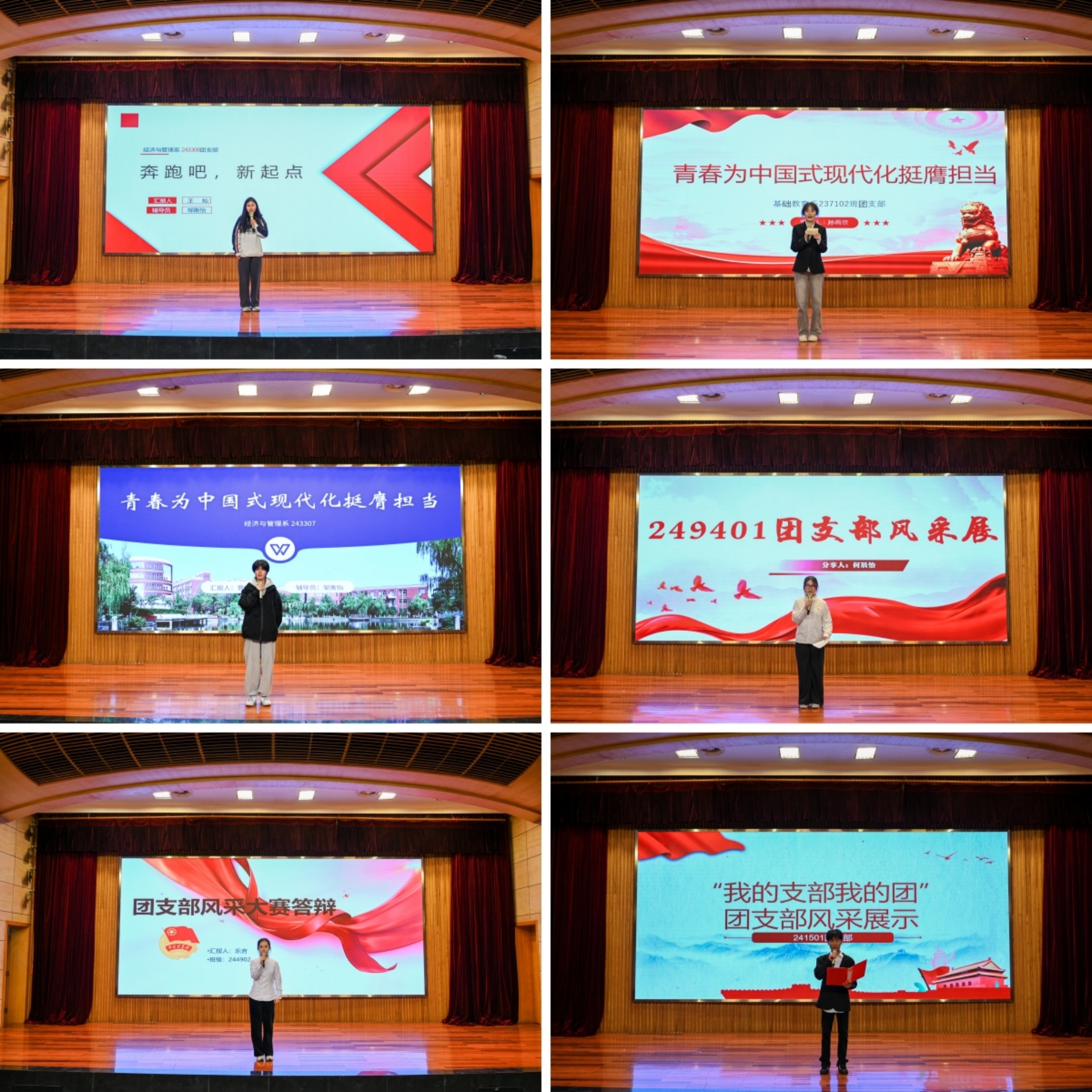 在各团支部通过PPT、视频等形式围绕思想引领、组织建设、志愿服务、社会实践、文体活动等方面展示发展过程和特色建设基础上,各团支部在汇报展演环节中以“青春为中国式现代化挺膺担当”为主题,采用情景剧、诗朗诵、合唱、舞蹈等多样形式展示了各团支部青春的活力与风采。情景剧拉近了历史的距离,带我们重温党领导人民百年奋斗的艰辛探索,风雨兼程;诗朗诵凝聚起惊涛骇浪中的豪情,字里行间饱含着对祖国的深情厚意,热忱满满;合唱引人入胜,旋律中流露出青年学生的蓬勃朝气,激情飞扬;舞蹈翩若惊鸿,每一个动作都诠释着青春的律动,活力四射。各团支部的表演展示了团支部积极向上、奋勇进取的精神面貌,展现出热爱生活、团结进步的良好氛围。