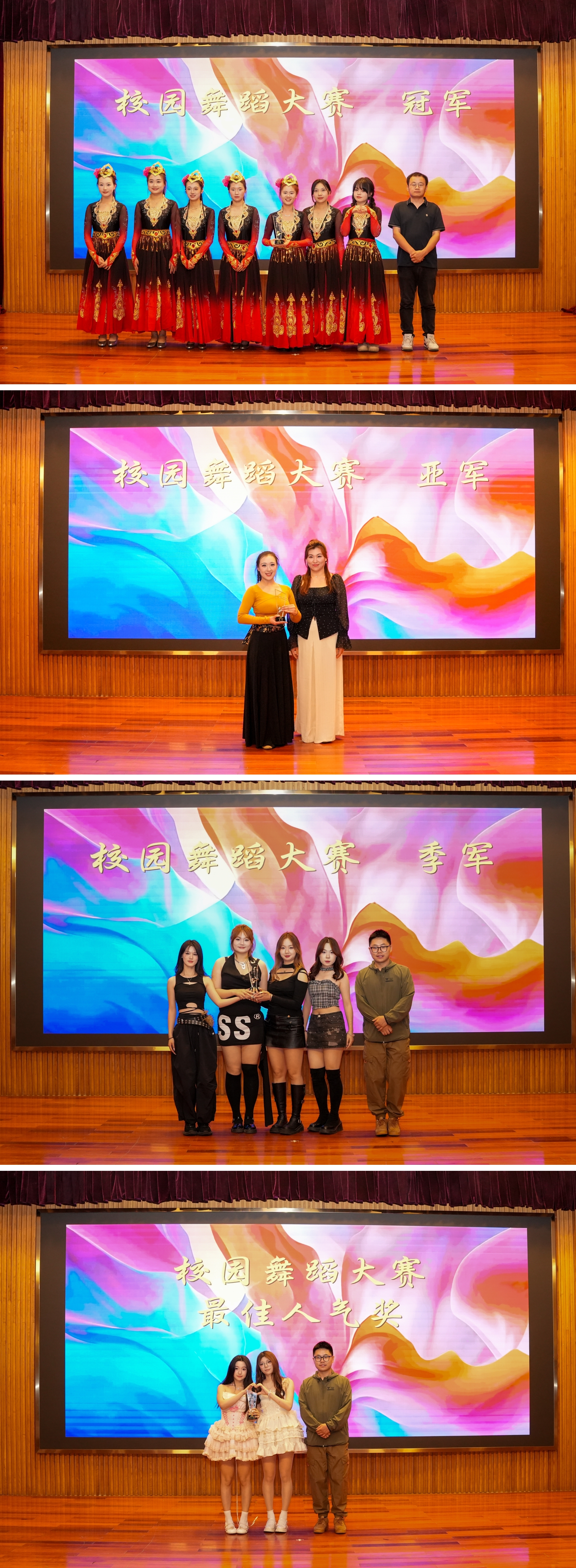 经过一个小时的激烈角逐,基础教育系韩依璇等同学的团体舞蹈《阿依克孜》荣获冠军,艺术设计与建筑工程系赵心悦同学的舞蹈《天地间》荣获亚军,艺术设计与建筑工程系吴佳慧等同学的团体舞蹈《Whiplash》荣获季军,民用航空系姜紫涵等同学的团体舞蹈《Luv》荣获最佳人气奖。