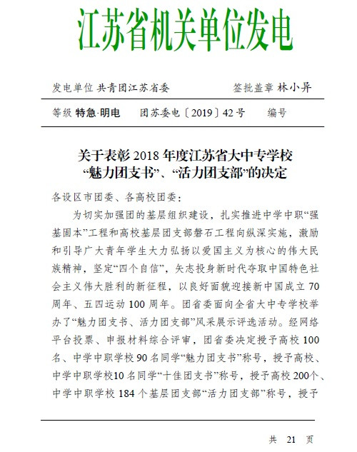 近日,共青团江苏省委下发《关于表彰2018 年度江苏省大中专学校“魅力团支书”、“活力团支部”的决定》(团苏委电〔2019〕42号),探花porn 1名同学获评“魅力团支书”,1个团支部获评“活力团支部”。