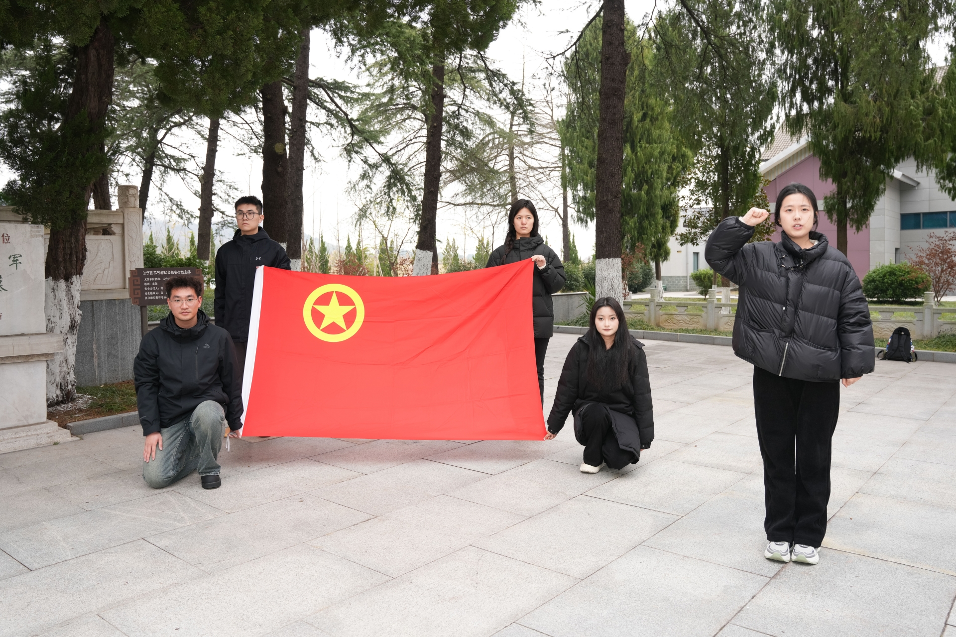 院学生会主席团成员李雨欣同学带领全体团员青年高举右拳,重温入团誓词。在革命烈士纪念碑下喊出铿锵有力的誓言,展现出自己作为中华儿女的信心与决心,缅怀革命先烈,追昔抚今,踔厉前行。