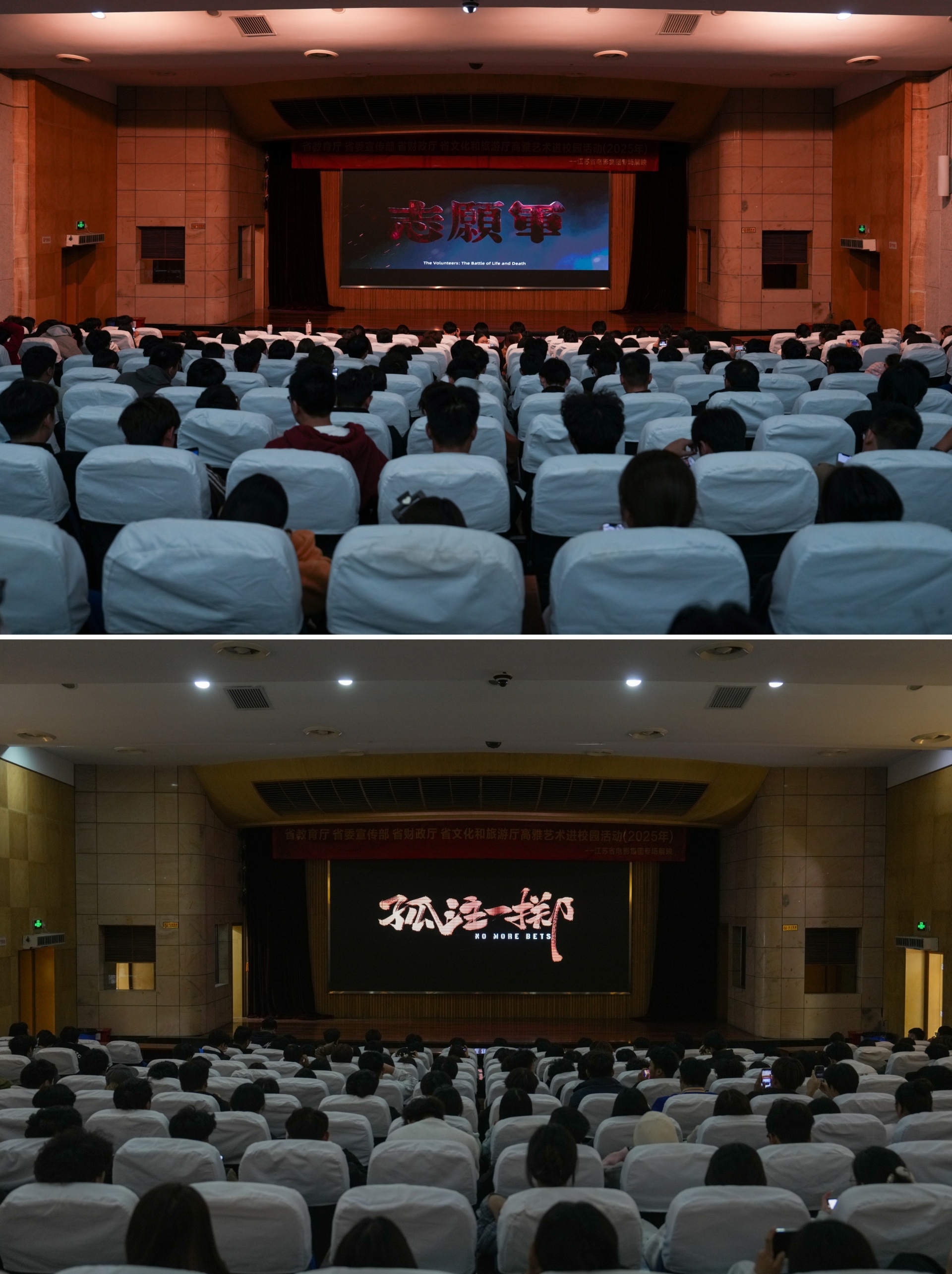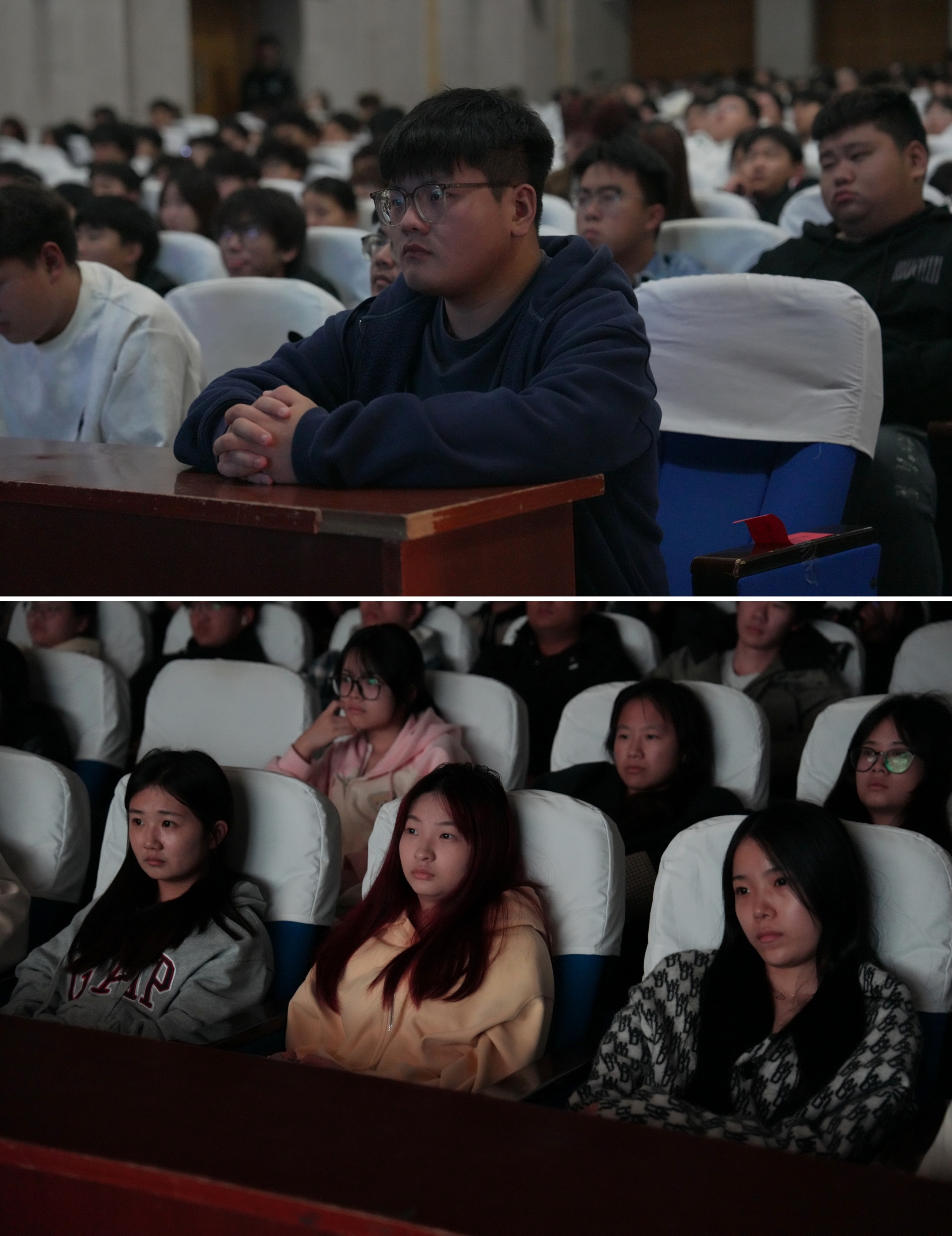 为深入推进校园文化建设,深化爱国主义教育,发挥优秀影视作品的思想引领作用,10月23日下午,探花porn 联合江苏省电影集团在报告厅举办“青春光影 逐梦未来”主题电影专场放映活动。本次活动精选两部兼具思想深度与艺术价值的影片《孤注一掷》《志愿军:存亡之战》,通过光影艺术为师生呈现了一场震撼心灵的精神盛宴,吸引近七百名师生到场观影,其中《志愿军:存亡之战》以其厚重的历史底蕴和强烈的情感共鸣,成为全场瞩目的焦点。