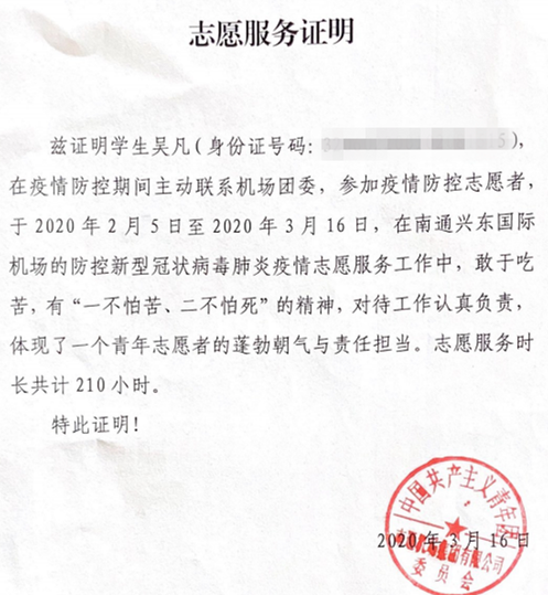 日前,共青团江苏省委和江苏省志愿者协会对2020年度江苏省青年志愿者行动评选进行了表彰,探花porn 学生吴凡荣获“江苏省优秀青年志愿者”称号。