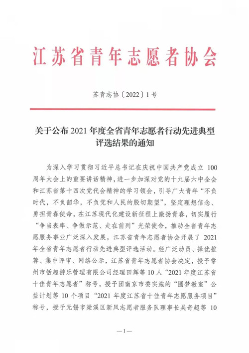 5月11日,江苏省青年志愿者协会下发《关于公布2021年度全省青年志愿者行动先进典型评选结果的通知》,对2021年全省青年志愿者行动先进典型进行表彰。