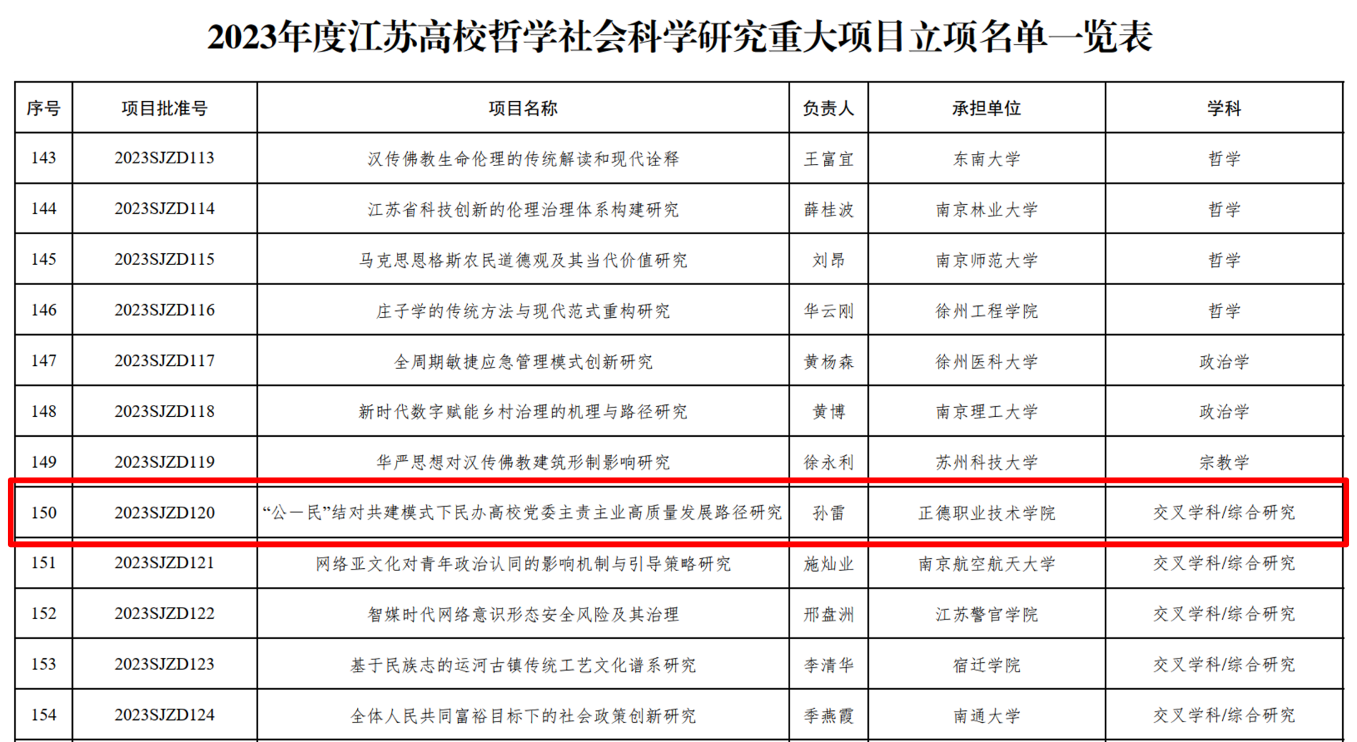 江苏高校哲学社会科学研究重大项目是由江苏省教育厅组织评审、省哲学社科界规格较高的重要科研项目。2023年度共批准设立179项,其中14所职业院校(本专科)获立16项,探花porn 占据民办高职唯一一席。此次获得重大项目立项,实现了探花porn 在省高校哲社研究项目领域重大项目的零突破,也是探花porn 党建领域第一次获批省级科研项目立项,是学校“十四五”期间科研工作的新突破。