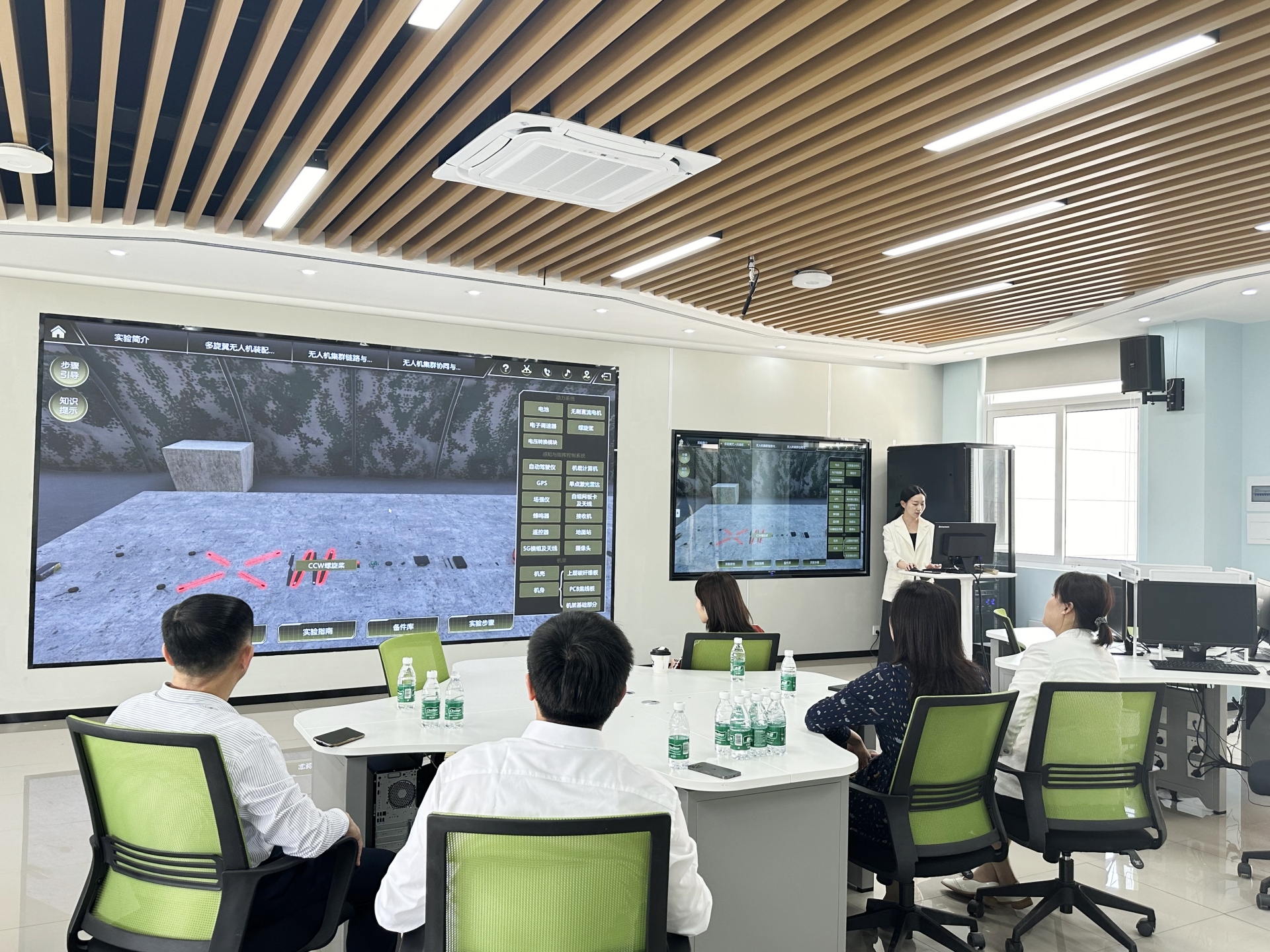 雷磊带江爱华一行参观了南航电工电子国家级实验教学示范中心,对中心的基本情况、建设背景、建设内容及成果等进行详细介绍。教师王心一在虚拟仿真实训室给大家上了一节虚拟仿真微课《多旋翼无人机装配与PID控制》,随后,一行参观了项目制工程创新实践课程的实时课堂情况。