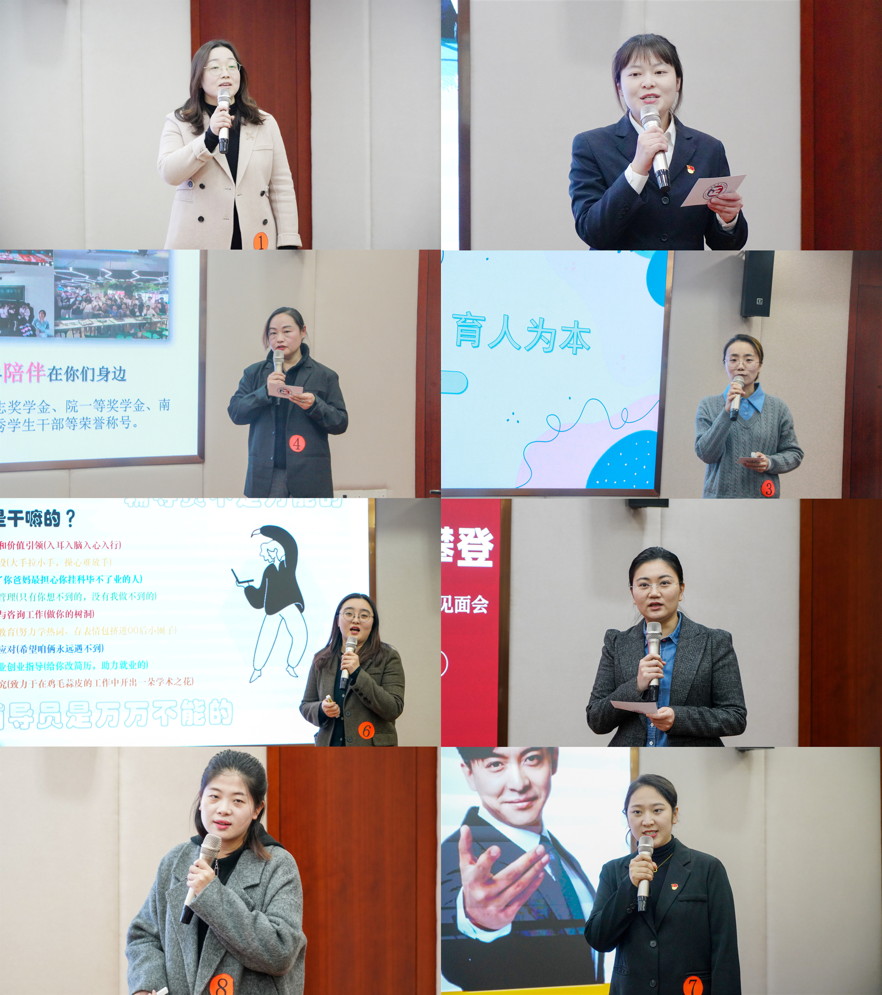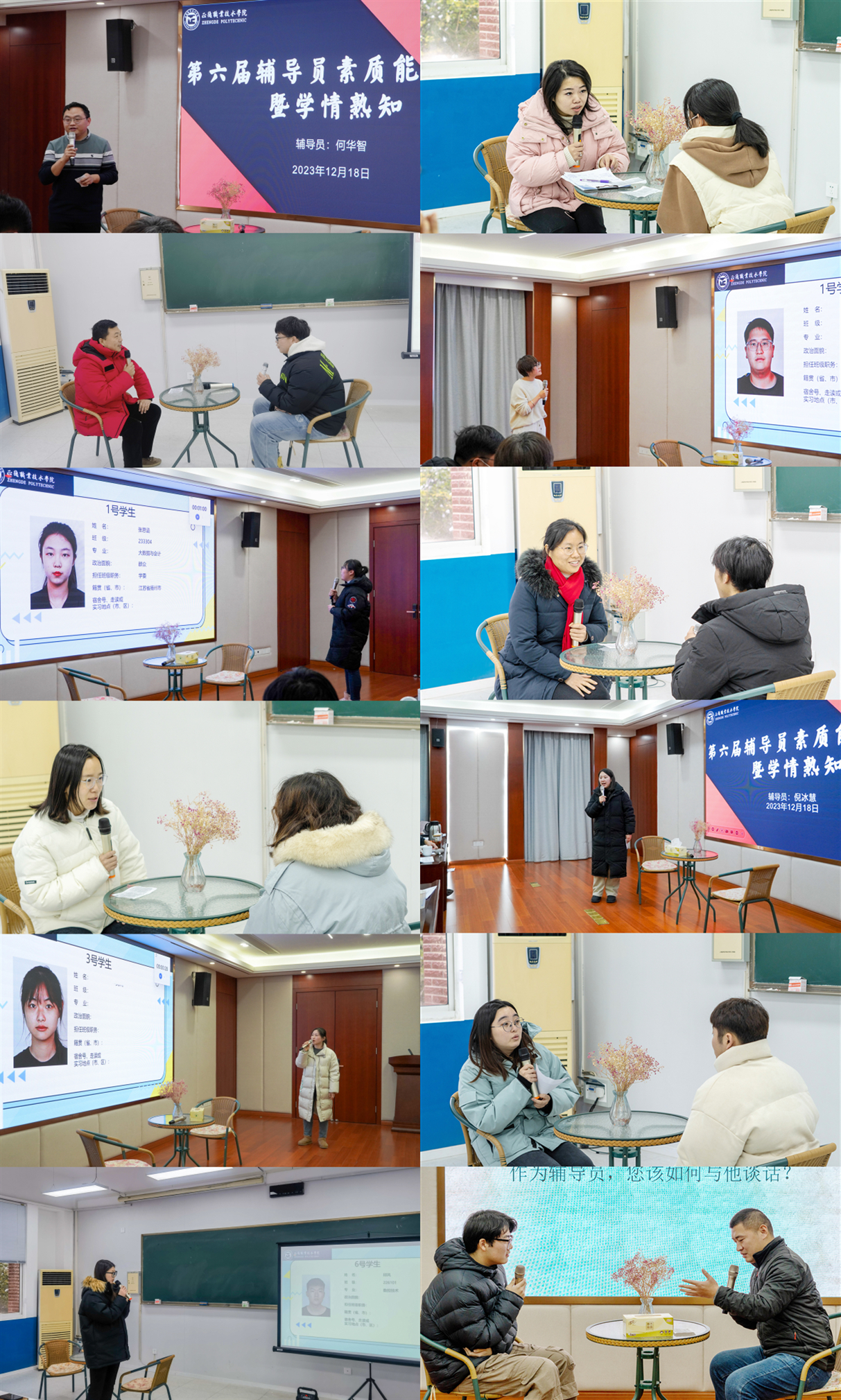 在班情熟知环节,随机抽取10名学生的照片,参赛的辅导员们对所带班级学生进行“描述定位”,展现了对班级学生的深入了解和关爱之心。