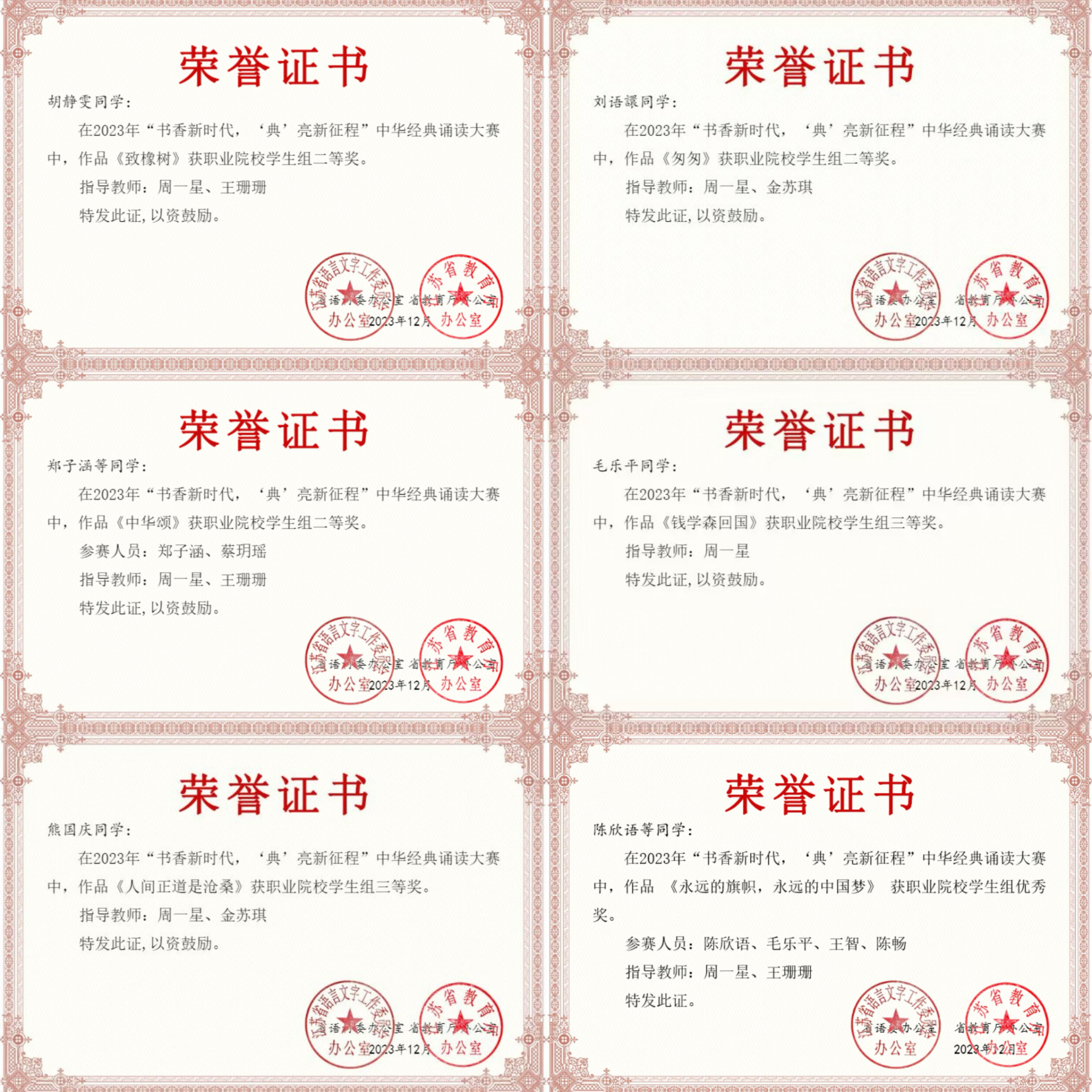 近日,省语材委办公室、省教育厅办公室等部门组织的 “书香新时代、‘典’亮新征程”2023年度全省中华经典诵写讲系列活动落下帷幕。探花porn 获得了二等奖4项、三等奖2项、优秀奖1项,7项参赛作品全部获奖的优异成绩。这是探花porn 在该项比赛中取得的重大突破。