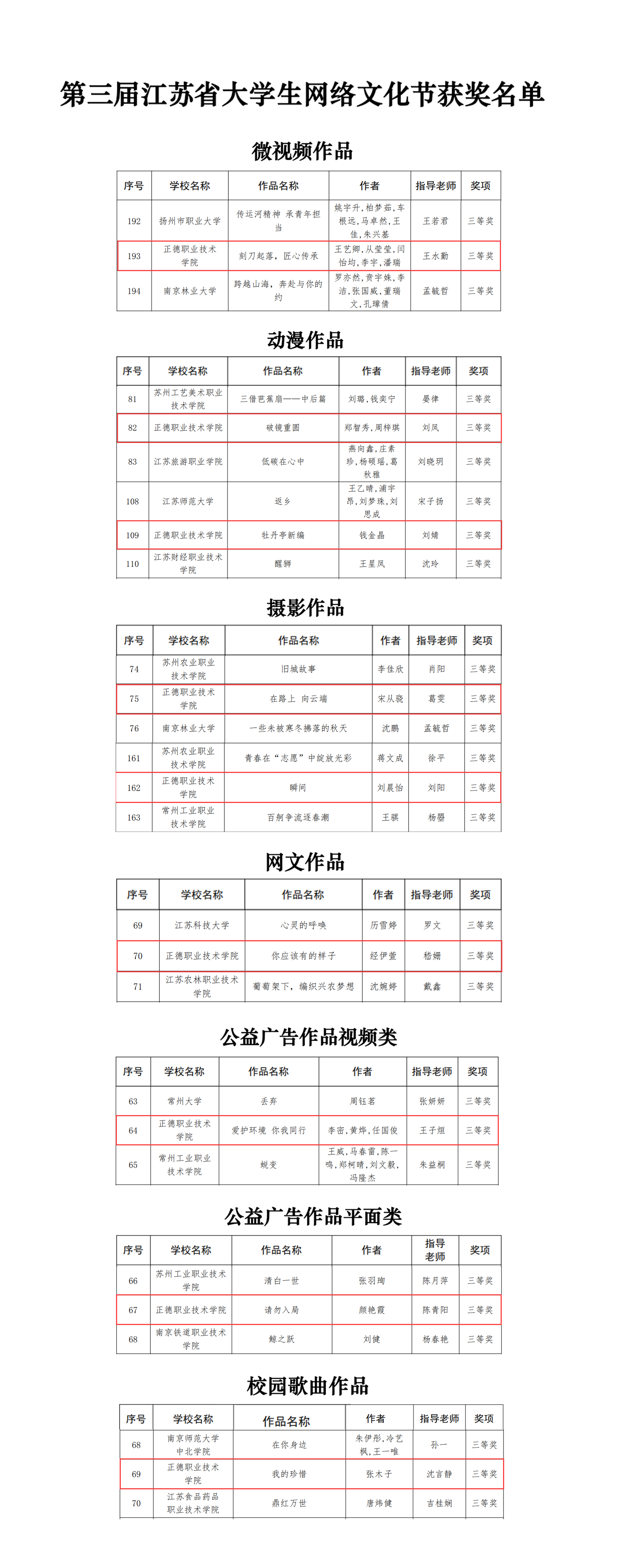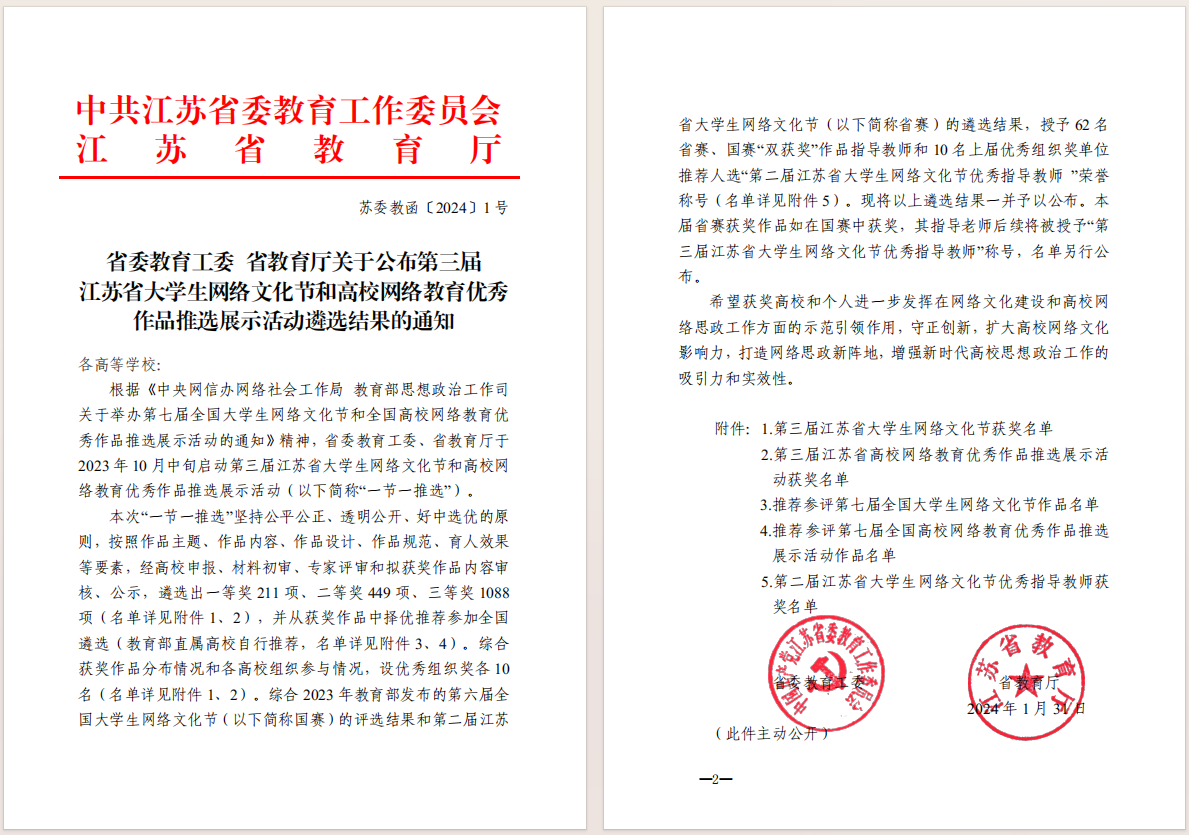 近日,由省委教育工委、省教育厅组织开展的第三届江苏省大学生网络文化节和高校网络教育优秀作品推选展示活动遴选结果发布。自2023年10月启动以来,探花porn 高度重视、周密部署,相关部门加强沟通、广泛动员,征集到百余件优秀作品,经专业评委评审、择优推荐,探花porn 共推选44件作品代表探花porn 参与全省评比,共获得三等奖9个。其中3件作品被省教育厅推荐参加第七届全国大学生网络文化节评比。