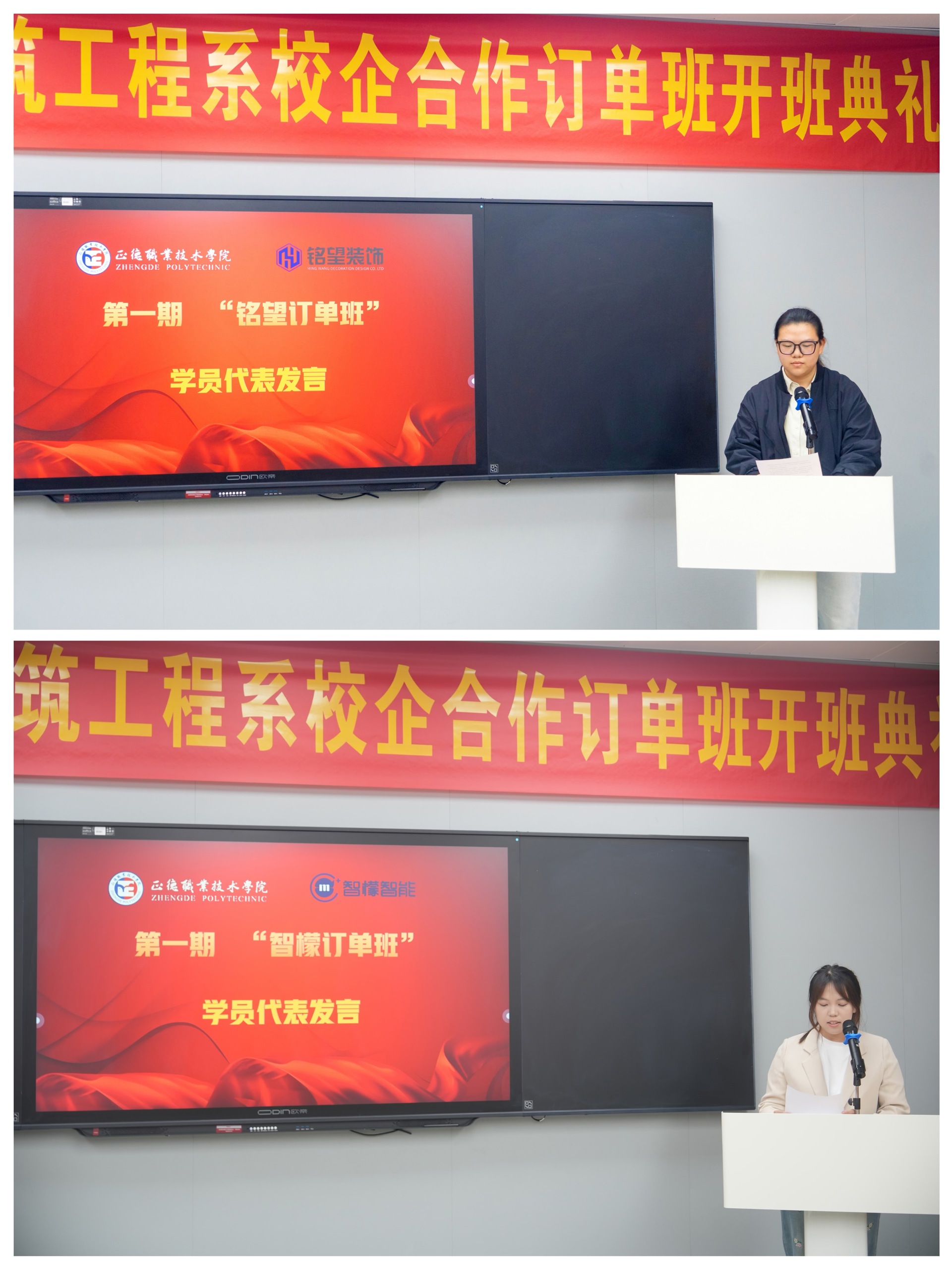 揭牌仪式后,首期“铭望订单班”与“智檬订单班”的学员代表分别上台发言,表达了对校企合作模式的期待和感激之情,并表示将珍惜这次难得的学习机会,充分利用校企合作平台提供的资源和条件,努力提升自己的专业技能和综合素质,为未来的职业生涯打下坚实的基础。
