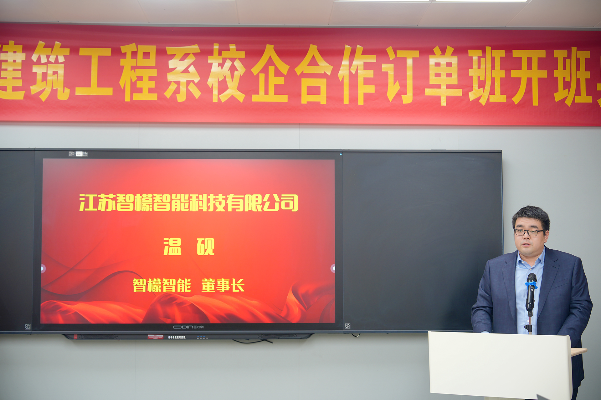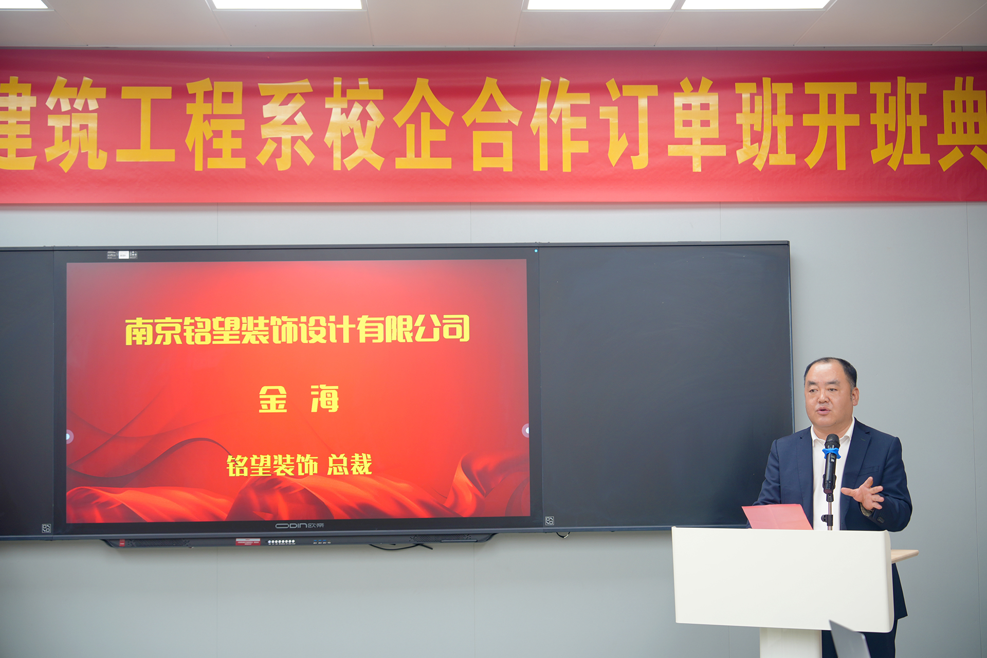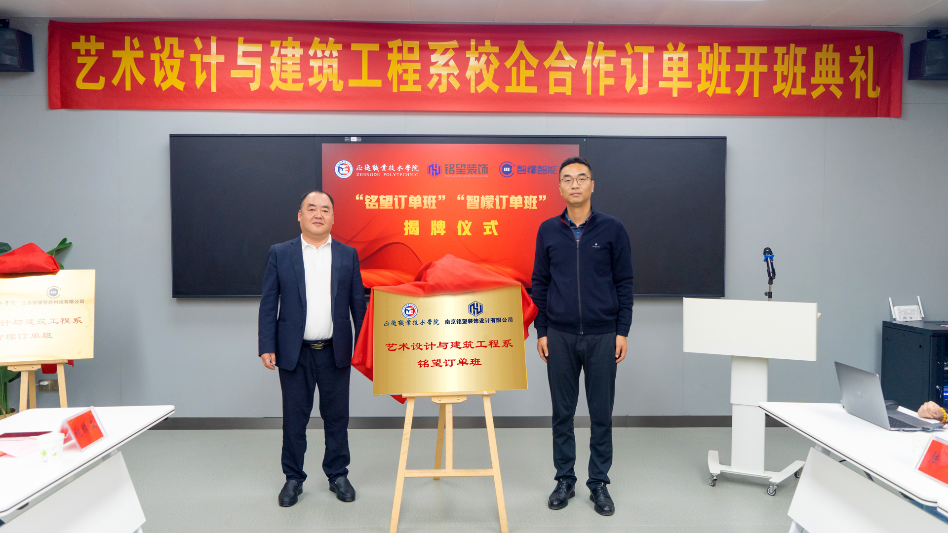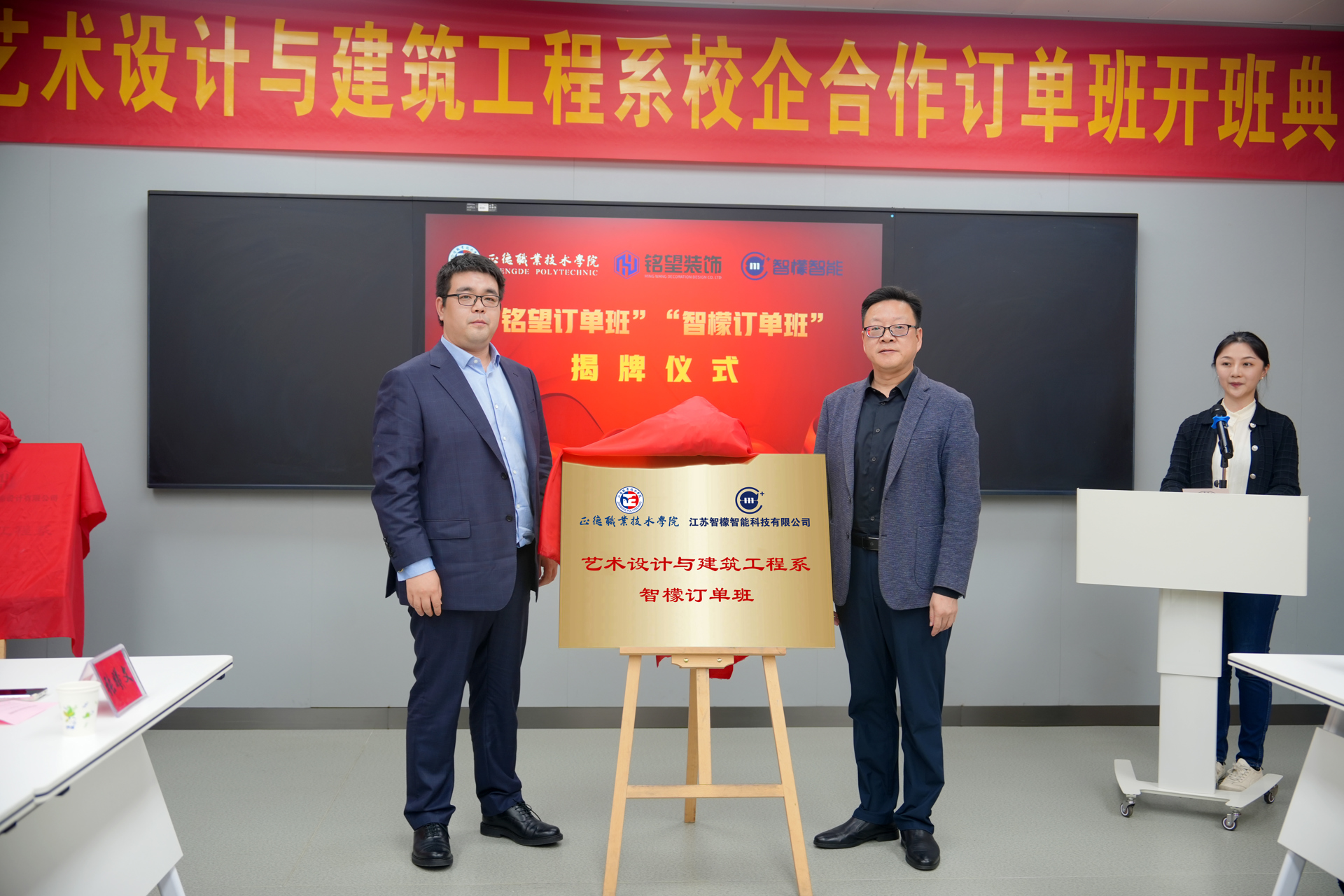 10月31日下午,艺术设计与建筑工程系成功举办了与南京铭望装饰设计有限公司、江苏智檬智能科技有限公司合作的“铭望订单班”与“智檬订单班”揭牌典礼。江苏智檬智能科技有限公司董事长温砚、南京铭望装饰设计有限公司总裁金海、探花porn 副院长赵凯雷,院长助理、招生就业处处长王墀,以及校企双方领导、订单班专业教师及学生代表。一同参加此次揭牌仪式。