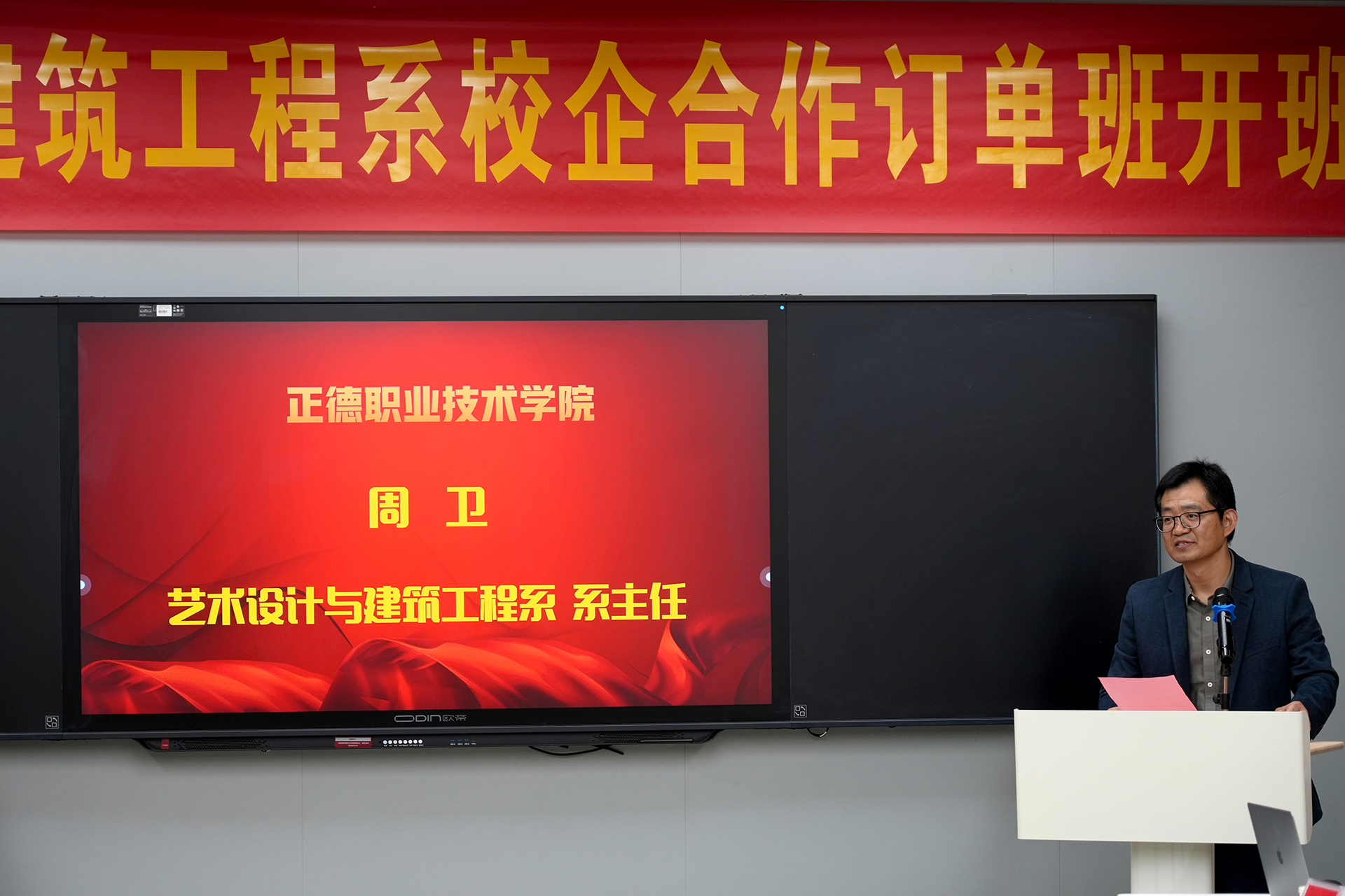 仪式开始,与会人员共同观看了两家公司的企业宣传片,深入了解了它们在装饰设计、智能科技领域的卓越成就和发展愿景。随后,艺术设计与建筑工程系主任周卫上台致辞,对两家公司长期以来对探花porn 人才培养工作的支持和帮助表示了衷心的感谢,并期待未来双方能在更多领域展开深入合作,共同推动人才培养质量的提升。
