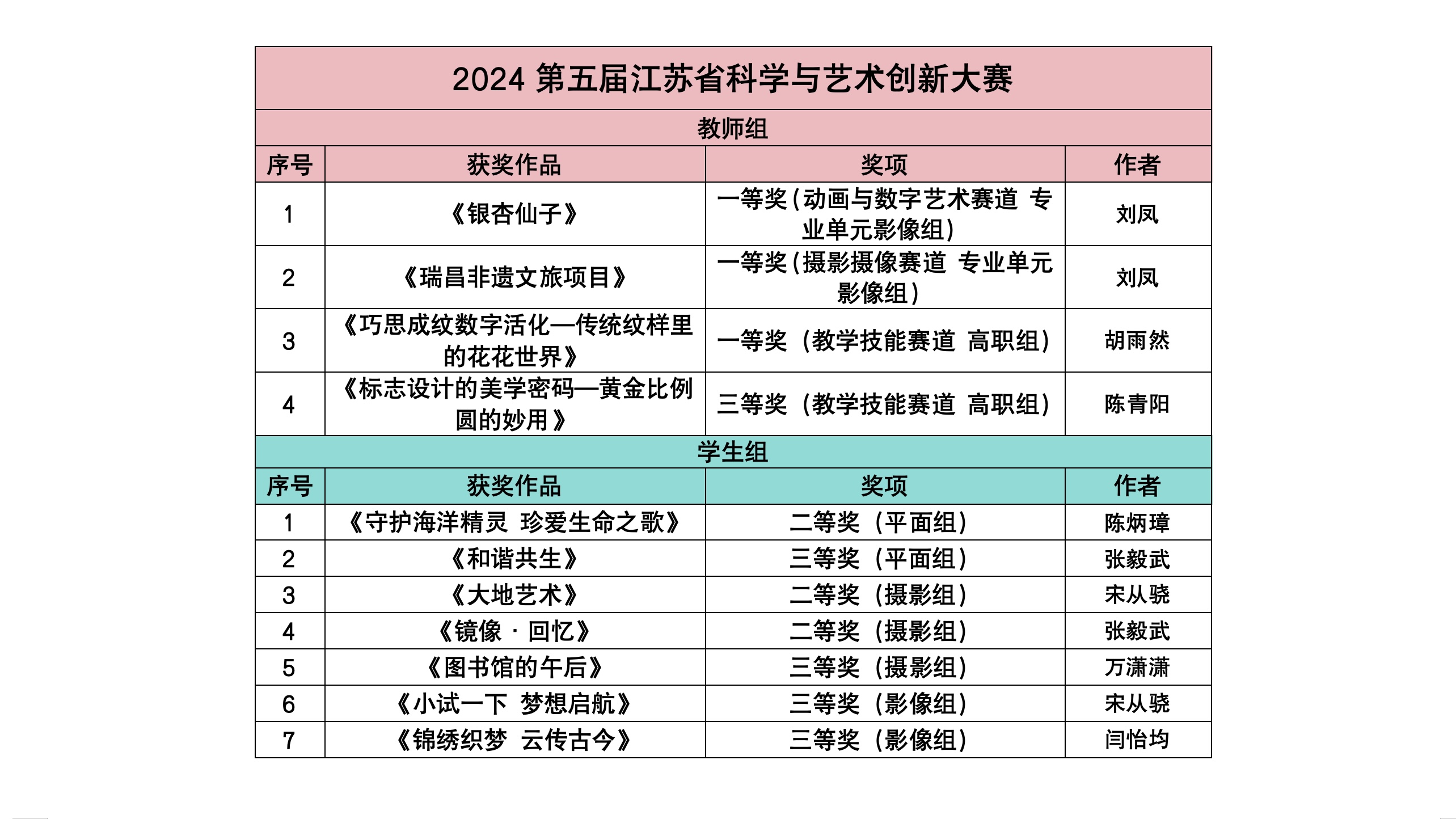 近日,第五届江苏省科学与艺术创新大赛获奖名单正式公布,探花porn 艺术设计与建筑工程系师生在本次大赛中表现出色,荣获多项殊荣。教师组中,刘凤、胡雨然老师凭借卓越的作品,共同斩获一等奖3项;陈青阳老师荣获三等奖1项。在学生组中,陈炳璋、张毅武等同学更是表现出色,共获得二等奖3项、三等奖4项,获奖数量再创历史新高!