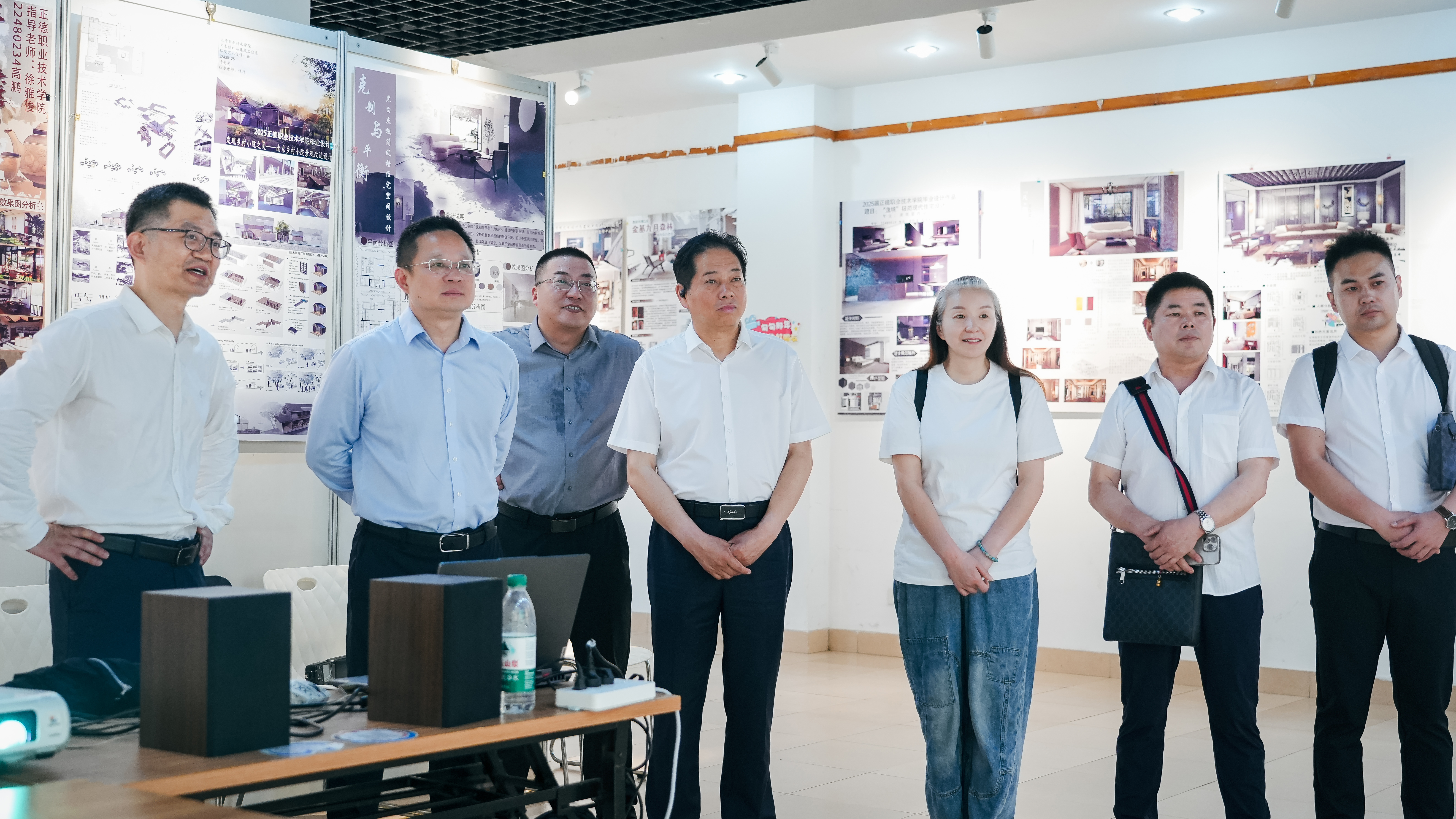 参观过程中,孙雷详细询问作品构思过程与技术应用,对艺建系紧扣社会需求、服务民生的设计实践给予高度评价。他强调,艺建系应进一步深化校企合作,探索“产教融合”新模式,为社会培养兼具专业能力与职业素养的高素质设计人才,并寄语毕业生“以创新为帆,以实践为桨,在职业道路上绽放光彩”。梁薇则肯定了学生的创新思维与实践成果,指出展览为校园文化注入了鲜活的艺术活力,期待未来涌现更多具有社会影响力的设计作品。