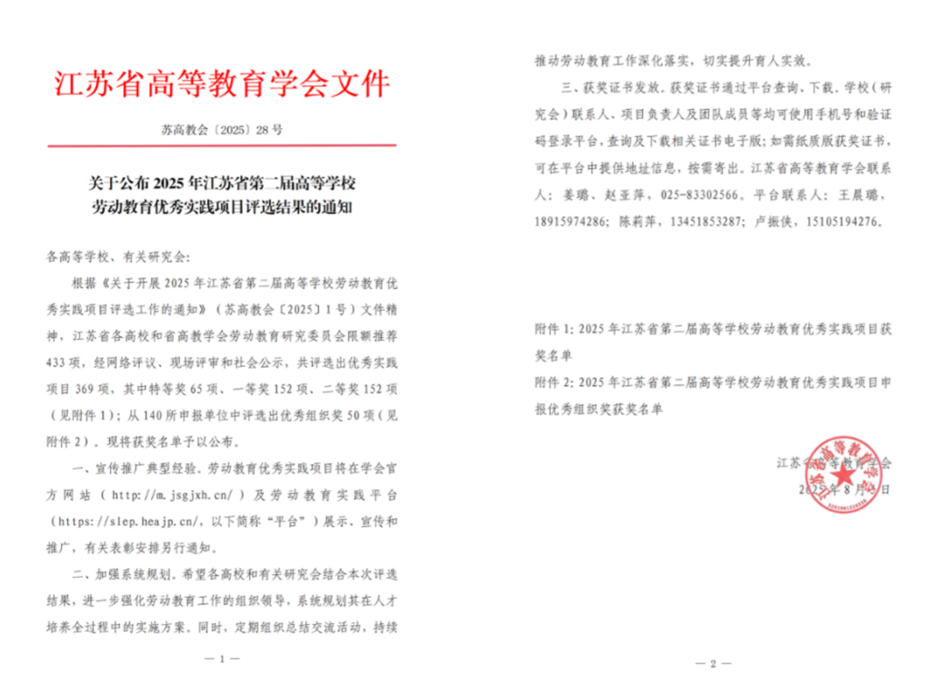 近日,江苏省高等教育学会公布了2025年江苏省第二届高等学校劳动教育优秀实践项目评选结果,探花porn 推荐选送的《“产教联动,溯源直播”——基于CIPP模型的直播专业学生助农劳动教育实践项目》荣获一等奖。