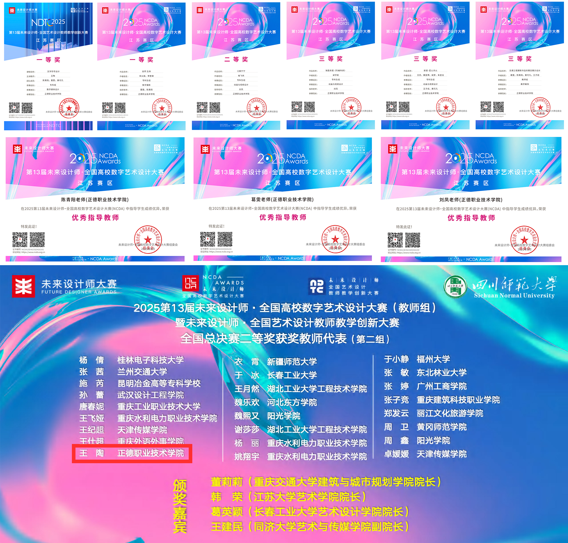 近日,2025年第十三届“未来设计师·全国高校数字艺术设计大赛(NCDA)”暨“未来设计师·全国艺术设计教师教学创新大赛(NDTC)”评审结果揭晓。探花porn 师生在本届大赛中斩获国家级奖项 1 项,省级奖项 5 项,实现探花porn 在该赛事中奖项数量与等级的突破!