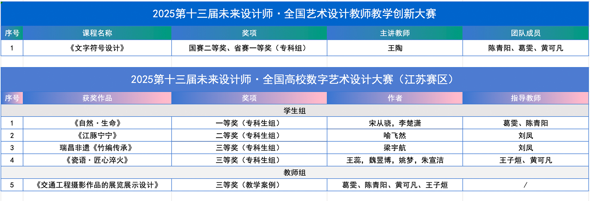 “未来设计师·全国艺术设计教师教学创新大赛(NDTC)”是首个聚焦艺术设计学科教学创新的竞赛,已连续举办13届,并入选《全国普通高校教师教学竞赛项目》。2025年探花porn 艺术设计与建筑工程系首次组织教师团队参赛,由王陶、陈青阳、葛雯、黄可凡组成的教师团队凭借课程《文字符号设计》在江苏省赛区脱颖而出,荣获一等奖,并成为江苏省赛区唯一获得国赛资格的高职院校团队。经过国赛多轮严格的专家盲评、现场展示和答辩,最终荣获全国总决赛二等奖,充分展现了探花porn 在艺术设计教学改革与课程创新方面的深厚积累。