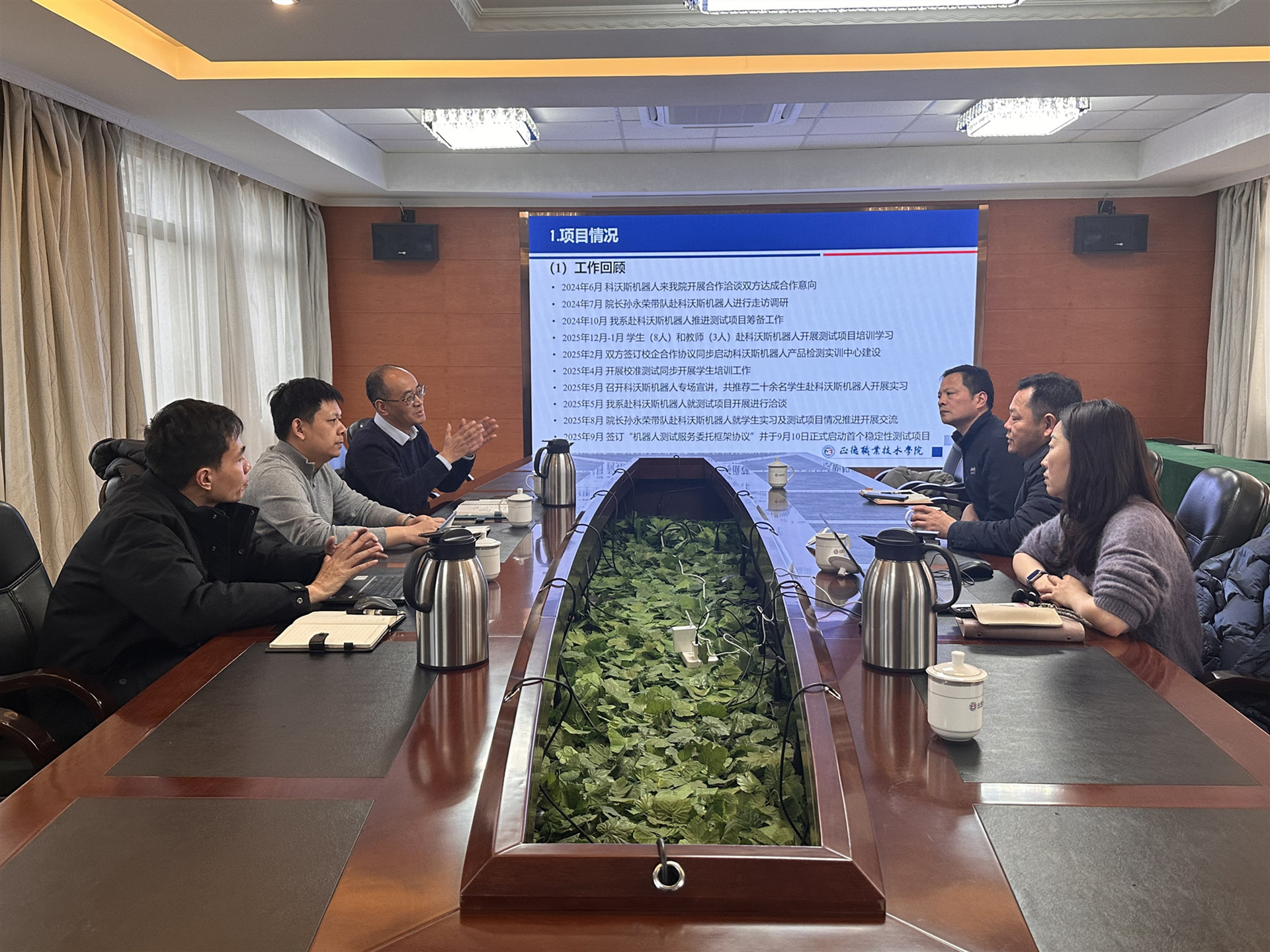 为深入推进“产教融合、校企合作”发展战略,创新人才培养模式,12月30日下午,科沃斯机器人股份有限公司(以下简称“科沃斯”)技术发展部总监王海军率项目集成评估部副总监吴清、高级测试经理马林锋等企业代表来访,与院长孙永荣、电子与信息技术系主任刘佳、副主任张宝华及师生代表共同召开“正德—科沃斯”机器人产品检测实训中心合作项目年度复盘会,总结阶段性成果,共商未来发展。会议由刘佳主持。