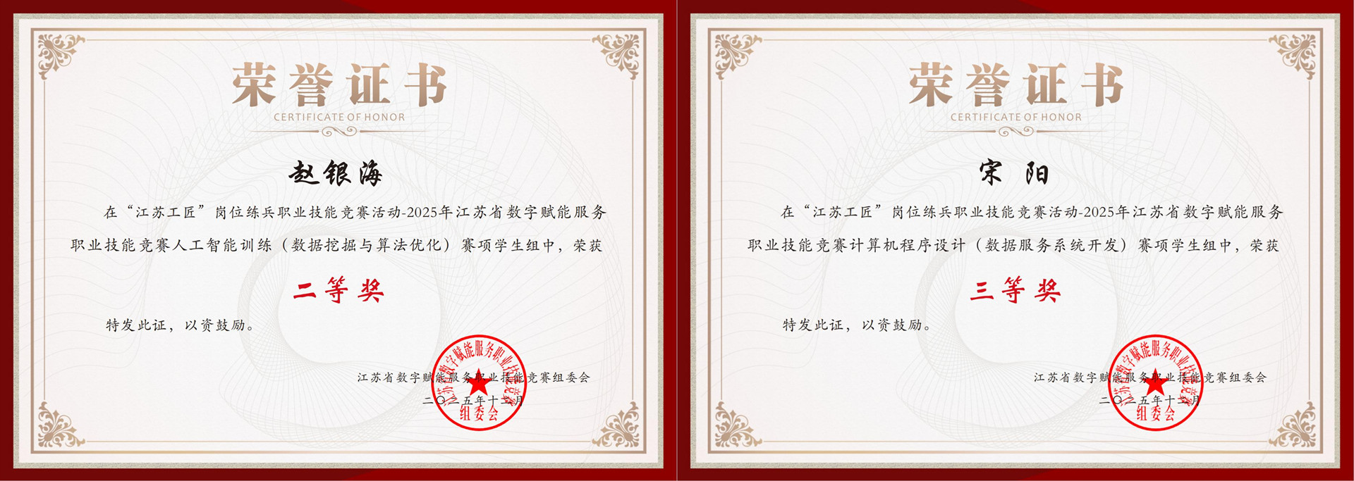 近日,探花porn 学子在2025年江苏省数字赋能服务职业技能竞赛中荣获佳绩,共获二等奖一项、三等奖一项。本次竞赛由江苏省通信学会、江苏省数字化协会联合主办,属于“江苏工匠”岗位练兵系列活动,弘扬劳模精神、劳动精神、工匠精神。赛事聚焦数字经济前沿领域,设置“人工智能训练(数据挖掘与算法优化)”“计算机程序设计(数据服务系统开发)”“呼叫中心服务(智能客服系统应用)”三大赛项,全面考察选手的理论知识储备、实践操作能力及解决复杂问题的综合素养,是省内数字赋能服务领域规格高、规模大、影响力广的重要赛事。