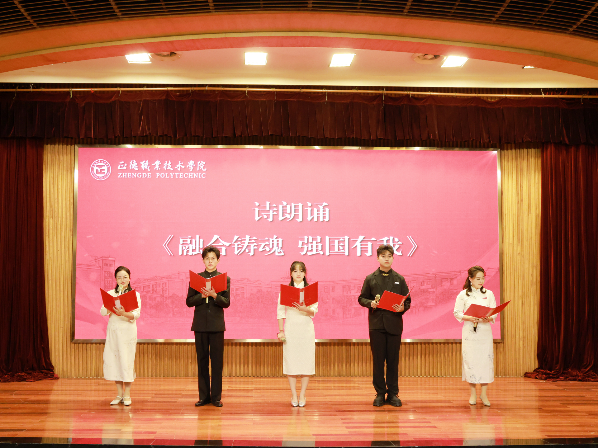 大会现场,师生代表共同朗诵原创诗歌《融合铸魂 强国有我》。朗诵者以饱满的情感、铿锵的语调,回顾了探花porn 一年来凝聚校企合力、推动“军工为峰,多域并举”战略转型的艰辛历程,抒发了全院师生扎根教育、赋能产业、助力强国建设的壮志豪情,也表达了对探花porn 高质量发展的美好期许。