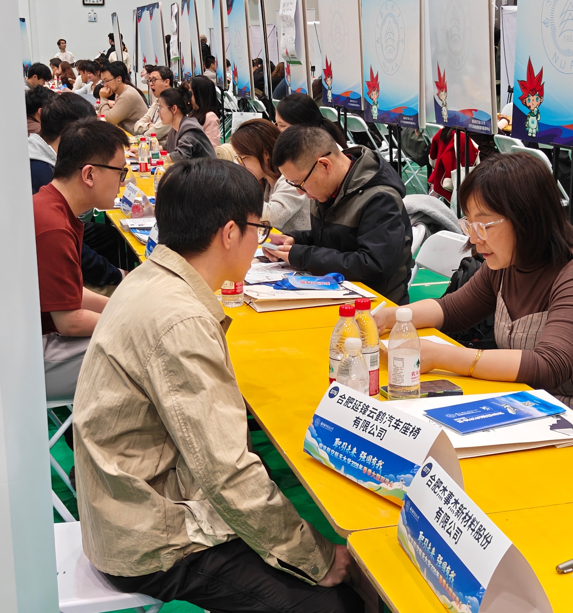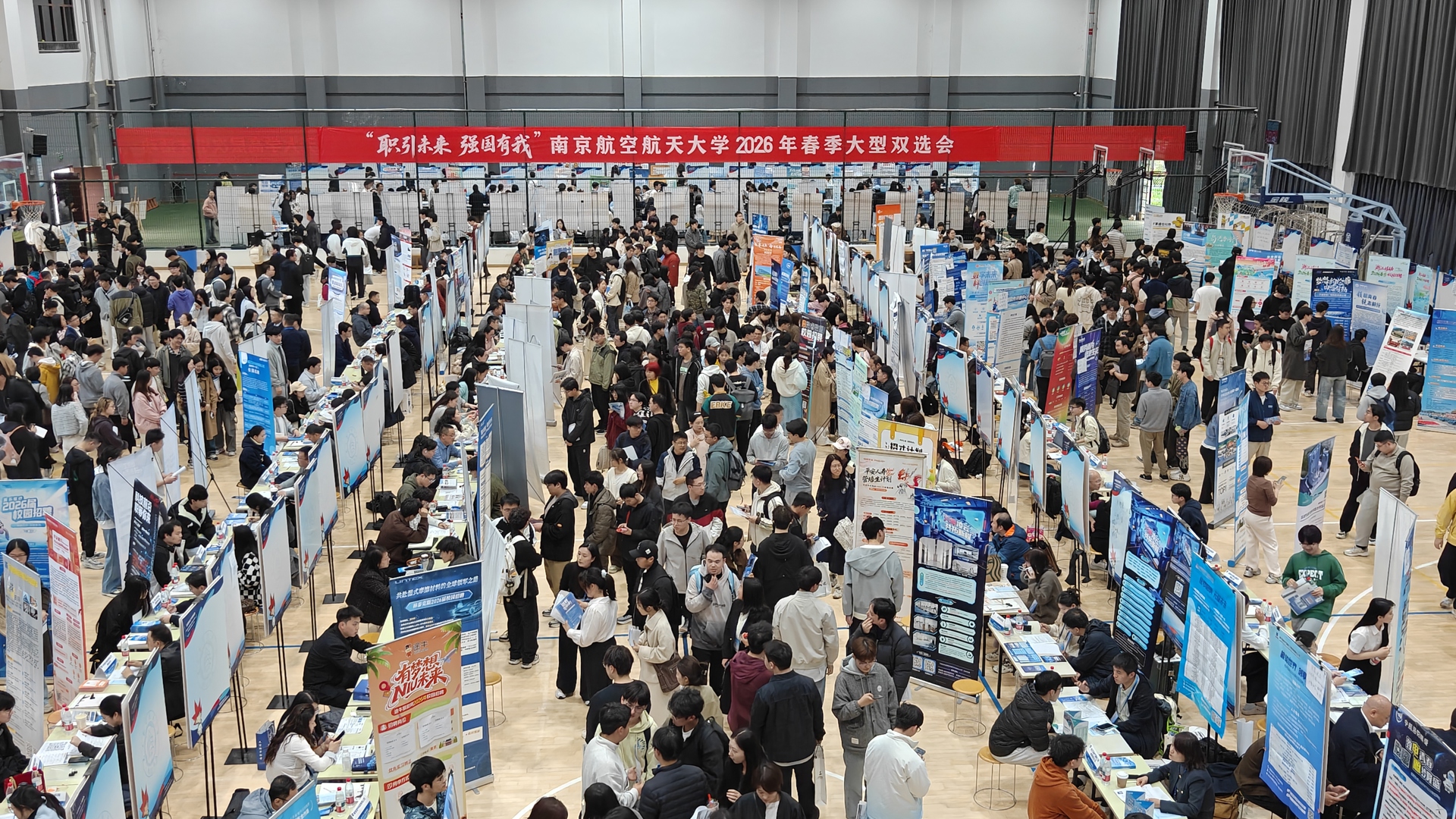 为促进毕业生高质量充分就业,搭建用人单位与毕业生高效对接平台,3月27日,南京航空航天大学在将军路校区东区体育馆、西区体育中心举行2026年春季大型招聘会,本次招聘会共邀请630+家用人单位赴现场揽才,同时邀请了无锡高新区、合肥市、马鞍山市、镇江市润州区、嘉兴市、贵阳市等多个城市地区人社部门组织优质企业组团参会。