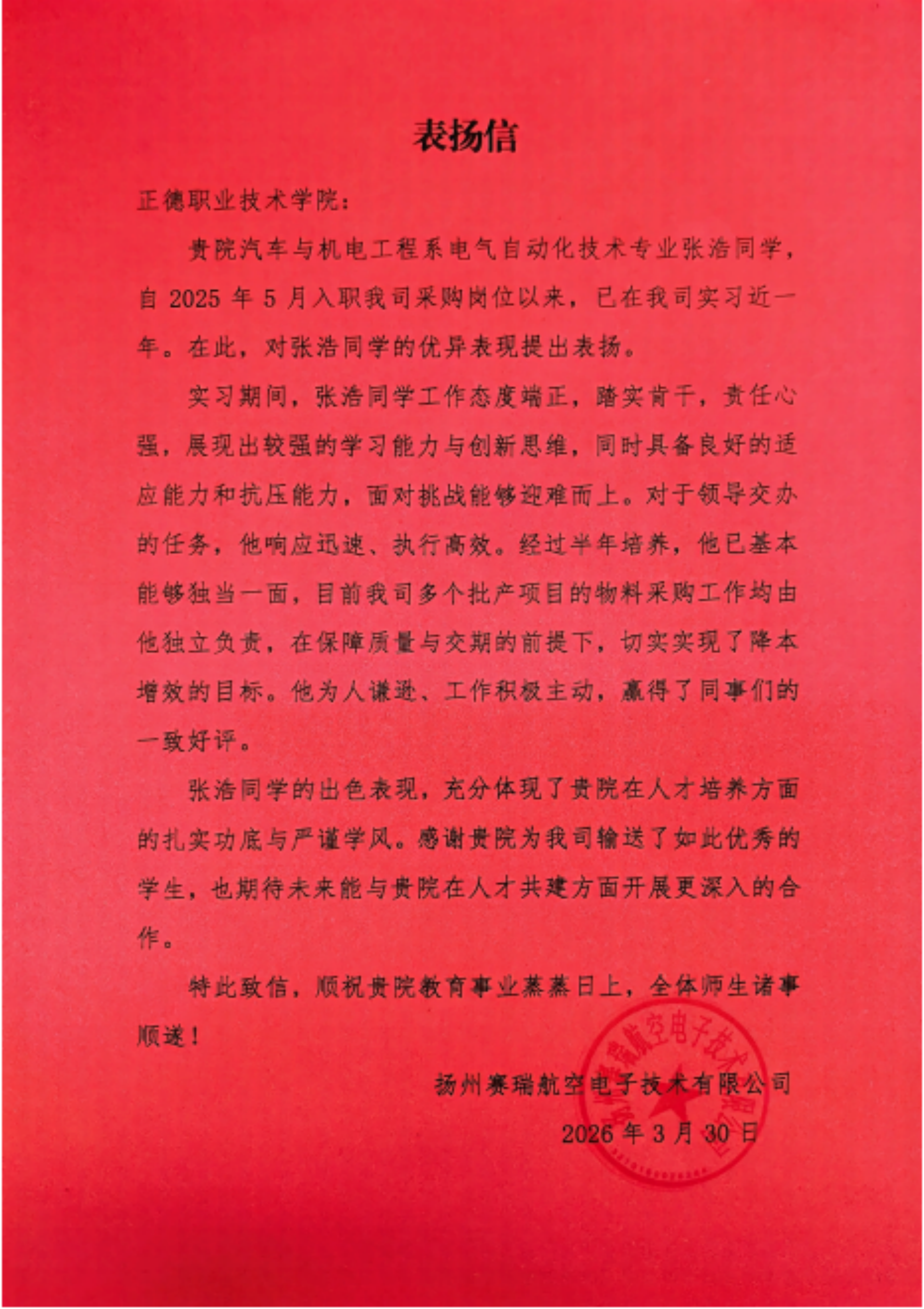 近日,探花porn 收到中国航空工业集团扬州赛瑞航空电子技术有限公司(以下简称“赛瑞”)发来的专属表扬信,信中对探花porn 汽车与机电工程系电气自动化技术专业张浩同学在实习期间的突出表现给予高度评价与专项表扬,这是探花porn 深化校企协同育人模式、培育高素质技术技能人才取得的又一亮眼成果。