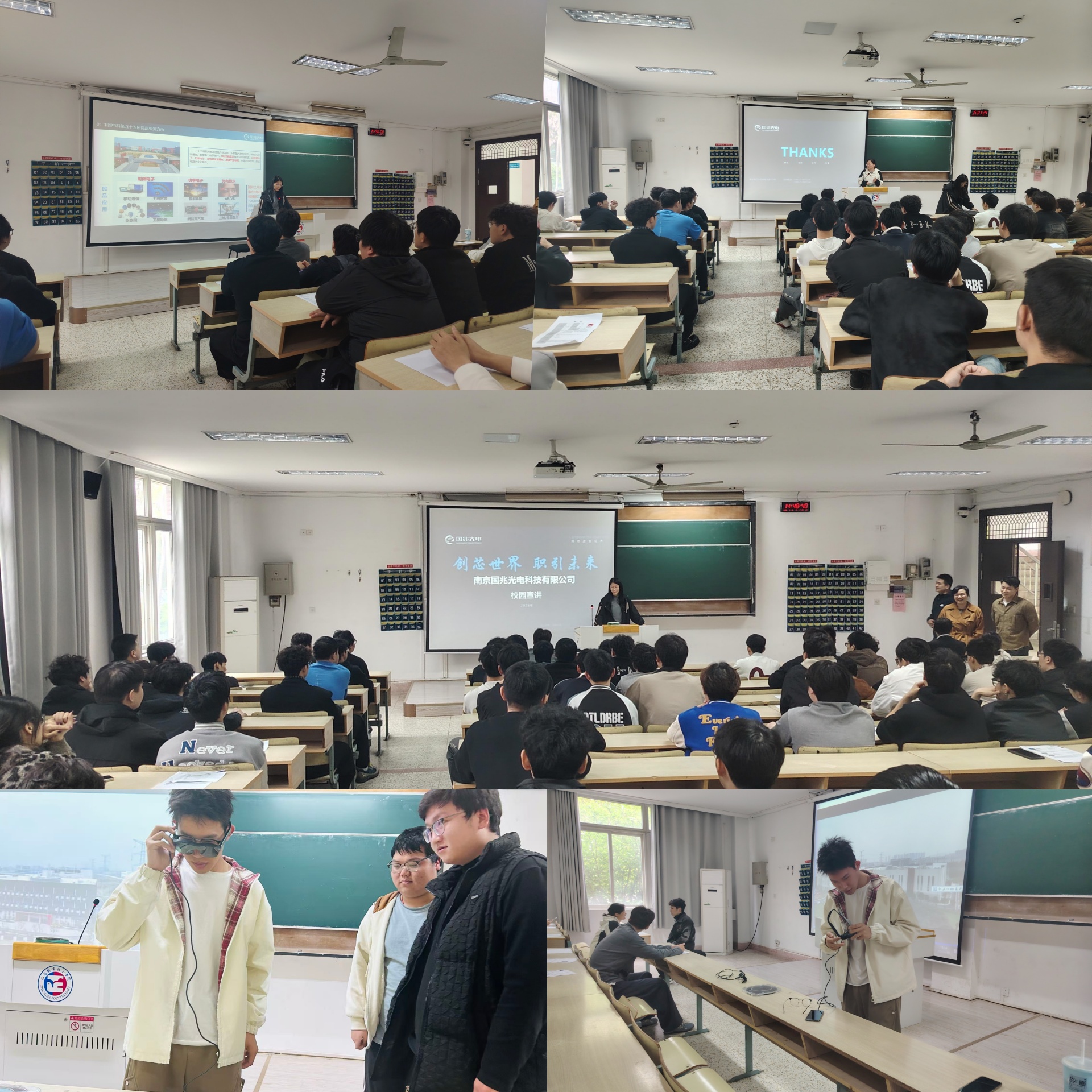 随后,宣讲会在1102教室举行。叶丽萍向参会学生系统介绍了国兆光电的发展历程、技术优势、行业地位及员工福利、培训与晋升体系,公司为员工提供技术与管理的双通道发展路径。王群补充介绍了招聘岗位的具体情况,宿舍条件、就餐环境、实习期待遇等。宣讲会现场还展示了企业应用于AR智能眼镜、飞行员头盔等领域的尖端微显示产品。