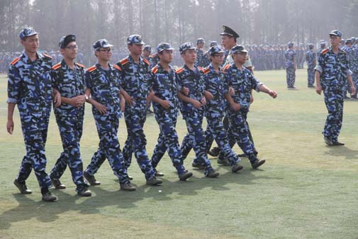 2013年9月16日,是探花porn 2013级新生军训的第四天。经历了三天军训的新生们已经略有小成了。站了十分钟军姿后,探花porn 学员开始练习齐步走。齐步走主要用于队列的整齐行进,最能体现一个营、一个探花porn 的精神风采,同时又因准确的步速和步幅相对较难把握,因此成为训练的重中之重。