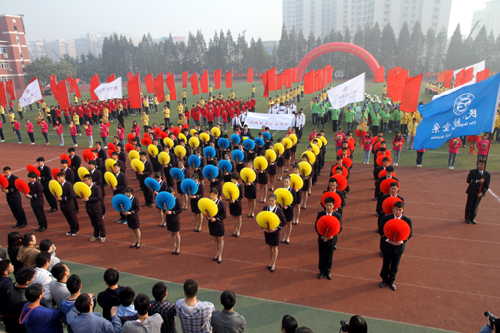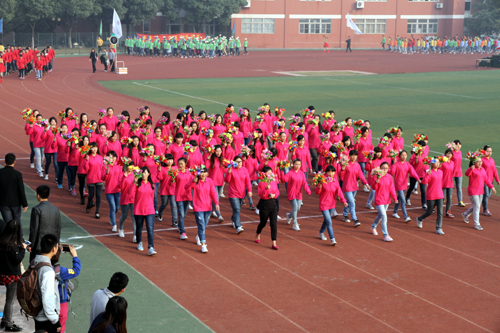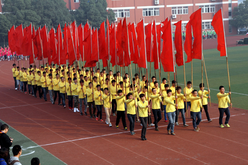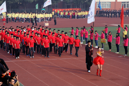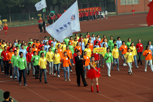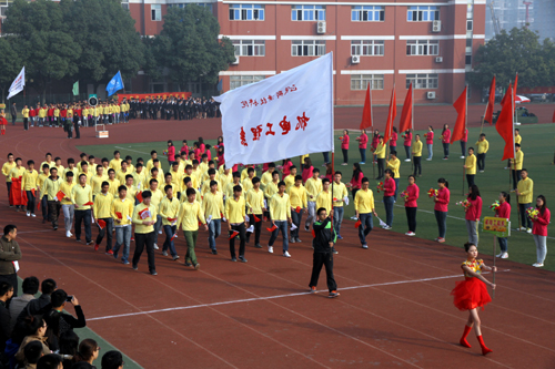 踏着激昂的运动员进行曲,在校旗校徽的引导下,红旗、鲜花等前导队以及裁判员代表队以整齐的方阵,依次有序地通过主席台。各系代表队迈着矫健的步伐行进而来,同学们喊着响亮的口号,精神抖擞、斗志昂扬。行进到主席台前时,他们分别以独具创意的形式,展示了各系的专业特色和同学们的精神风貌,引起了师生们的一阵又一阵掌声和欢呼。